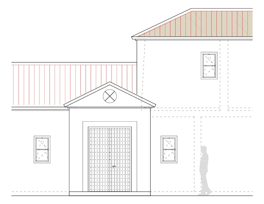 traditional spanish villa walls off white plaster bands white window frames sage green antique style solid wood entrance door with brass studs paving in the foreground circular opening with decorative metal devisons