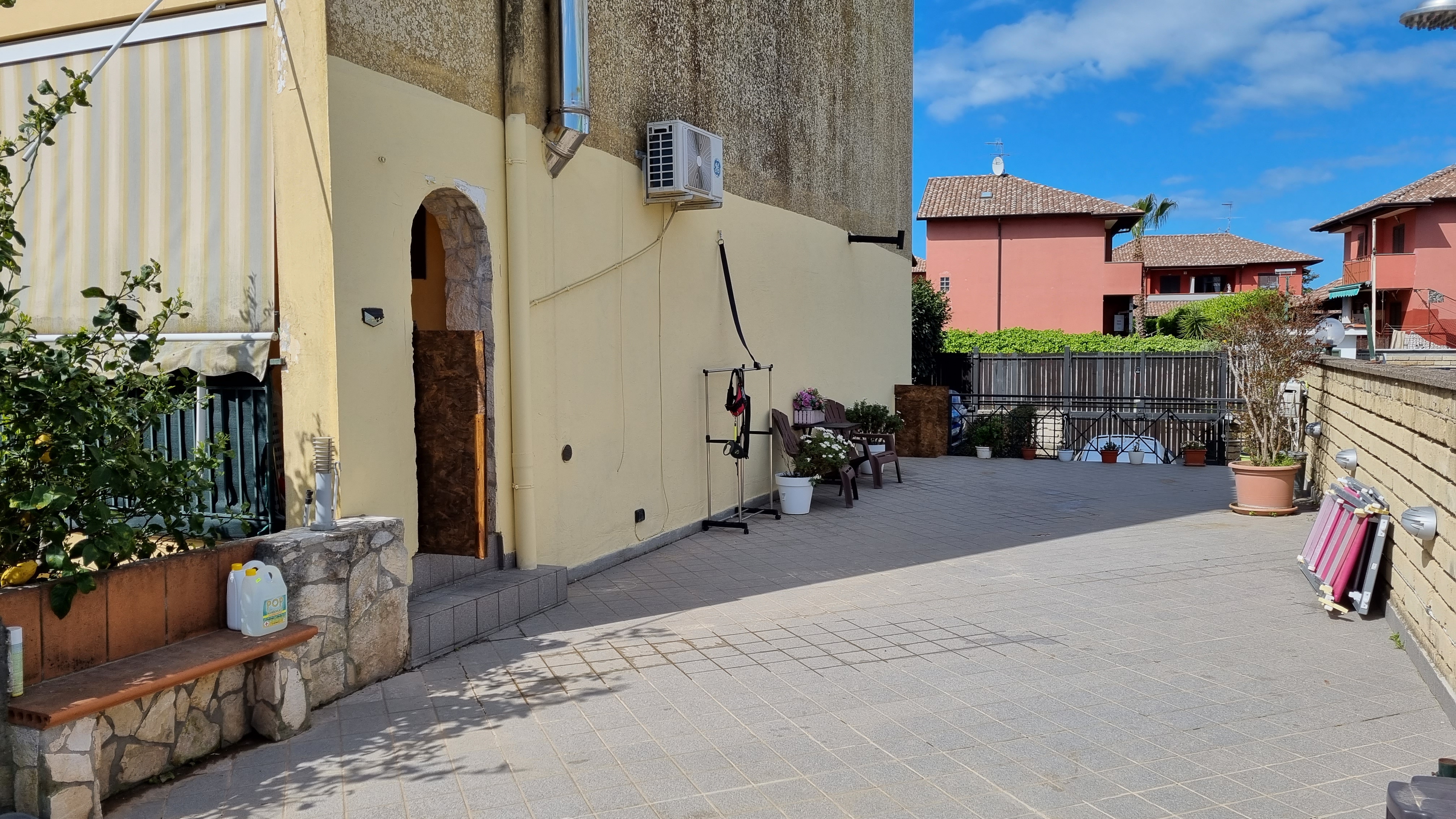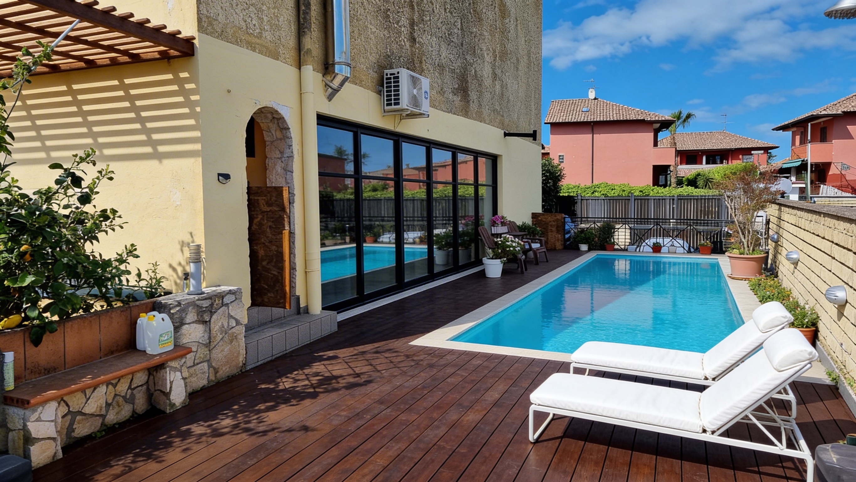 inserisci piscina a sfioro tettoia alla parete sinistra in legno lamellare pavimento in legno scuro infisso in alluminio nero per l intera larghezza della parete di sinistra uniforma l intonaco a tutt altezza della parete sinistra inserisci molte piante e vasi di fiori e due lettini bianchi con cuscino biano alto uniforma l intonaco anche nella parte alta della parete togli la cadotoia la canna fumaria inox e il condizionatore e inserisci una tettoia in legno lamellare