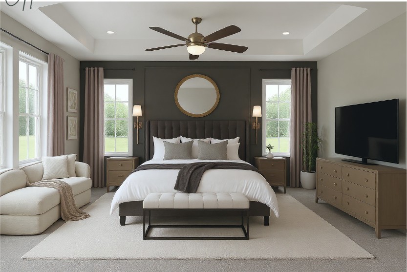 exterior shot render this room in 3d and paint the flat part of the tray ceiling a dark color
