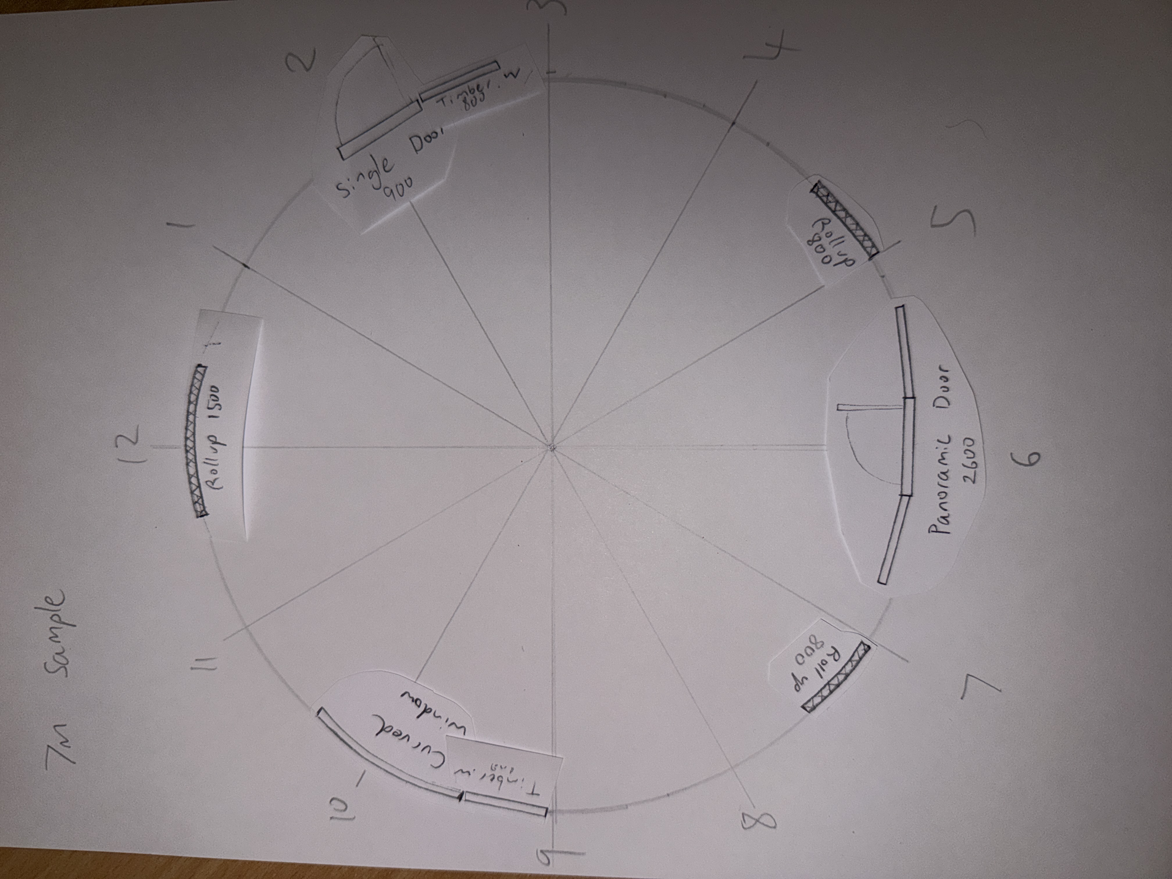 interior from the top this is a plan view for a 7m diameter yurt place a bed at 12 oclock place a couch at 4 oclock place a kitchenette between 7 and 9 oclock door at 2 oclock leads to a corridor to another smaller yurt add any other details you see fit
