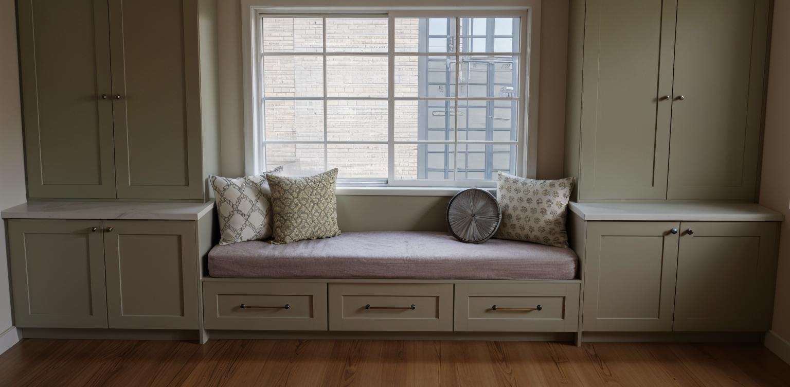 create a cozy elegant living room setting with built in cabinetry in soft olive green adding warmth with a light wooden floor a large window with white frames allows natural light to flood in giving a fresh and airy feel include a cushioned window seat in muted pink for comfort accented with decorative pillows one with a pastel geometric pattern another in sage green with a subtle floral design and a round gray pillow ensure the room has a serene and inviting atmosphere