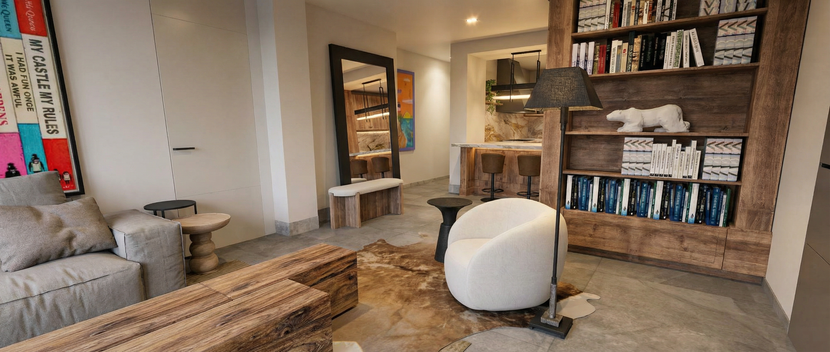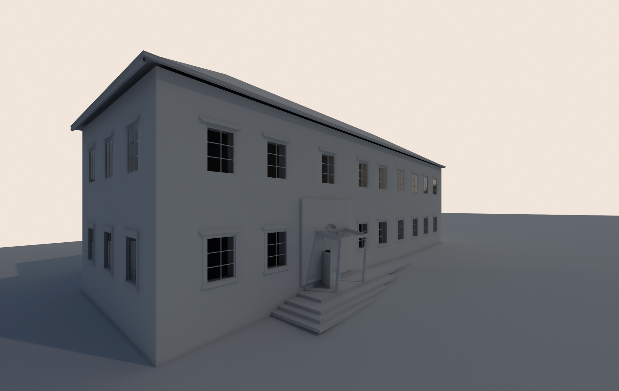 greenery and trees on the right of the building low old buildings on the left paved floor in front of the building bushes on both sides of the entrance no letters on the picture delete the written sign clouds in the sky beautiful sunny day old church behind the building on the left a road on the left of the big building classical pavement in front of the building then grass with small bushes the fascade should be creamy white