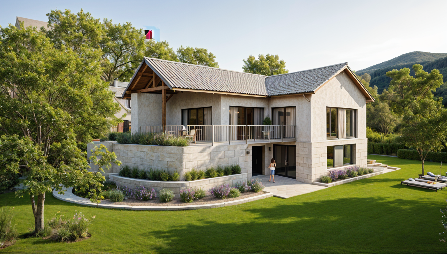 tree and side of house background porcelain tile patio light blue stucco house fire pit in center step up deck on right