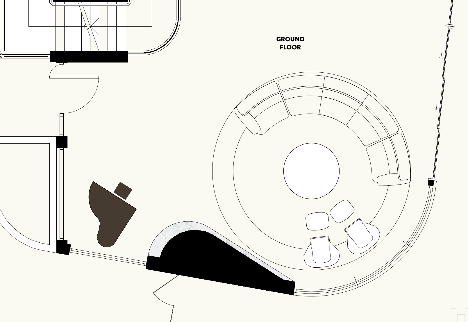 this is a floor plan i want to create a 3d of a stone clad white organic shaped wall with marble plinth tv and fireplace jardan curved sofa fire place and full height 3m windows around with sheer curtains super modern and luxe focus on fireplace