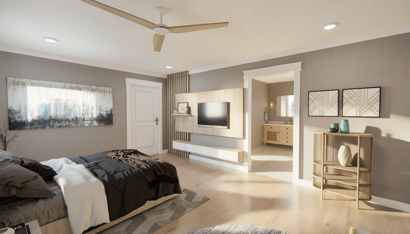 you are a professional image renderer you create the highest grade renderings around and specialize in architectural renderings this is master bedroom create a high resolution photorealistic image of this structure keep the windows as they are where they are keep the doors as they are where they are keep the main structure as it is where it is feel free to change the perspective do not add anything to the structure that i have not asked for the style is organic modern