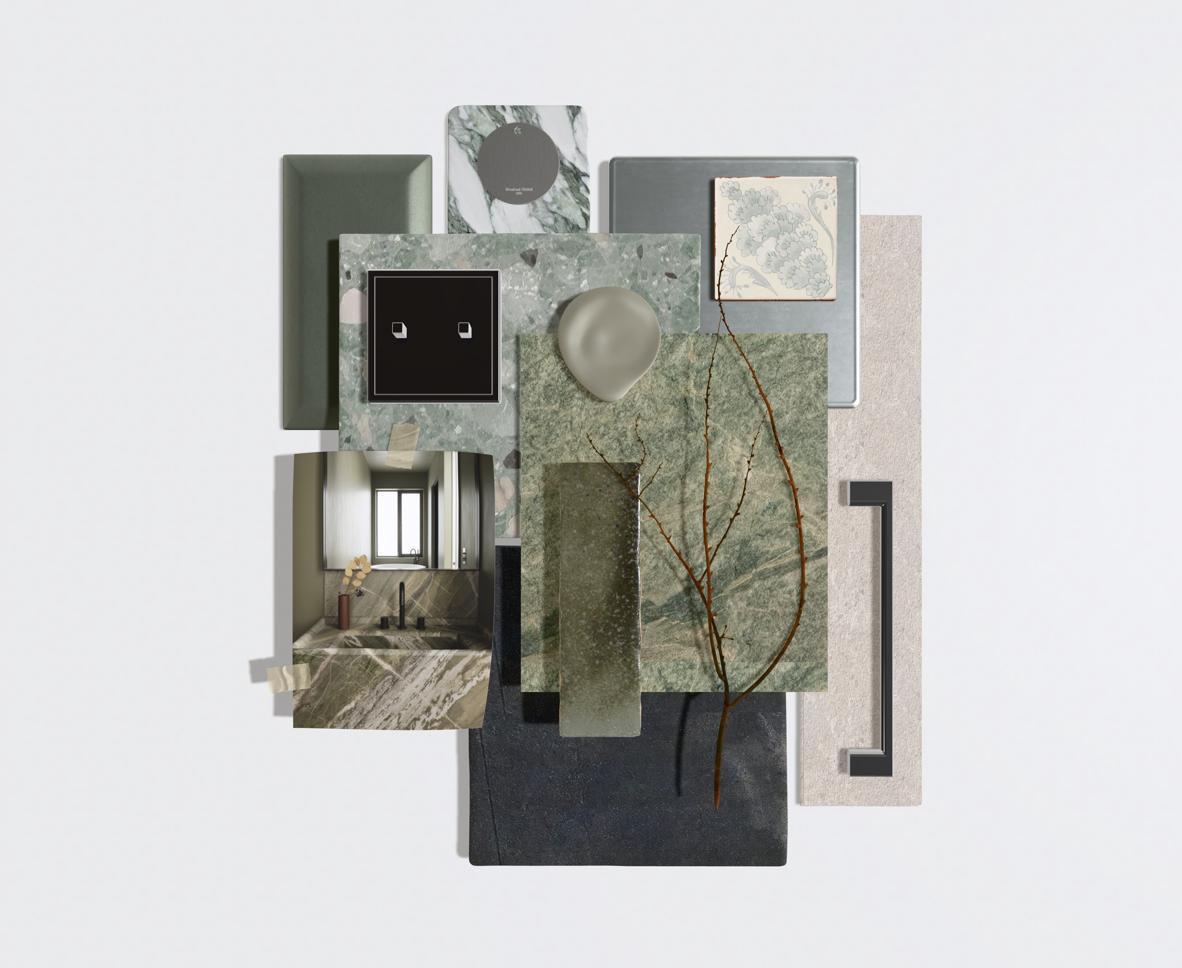 architectural material board for a contemporary thermal bathhouse recovery lounge inspired by forest canopy conditions flat lay composition on neutral warm background vertical patinated wood slats in muted sage undertones thermally modified ash lightly brushed cedar texture honed warm limestone flooring sample moss green mineral tile with matte finish oxidized bronze metal accent linen upholstery swatch in soft oat tone perforated wood screen casting dappled shadow pattern subtle skylight detail showing ceiling to wall vertex clerestory opening natural daylight color temperature emphasis on texture grain patina and material depth minimal labels clean layout high detail realistic architectural presentation board soft shadows professional studio lighting