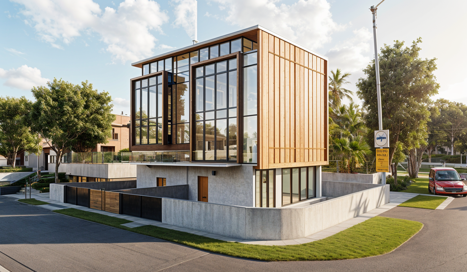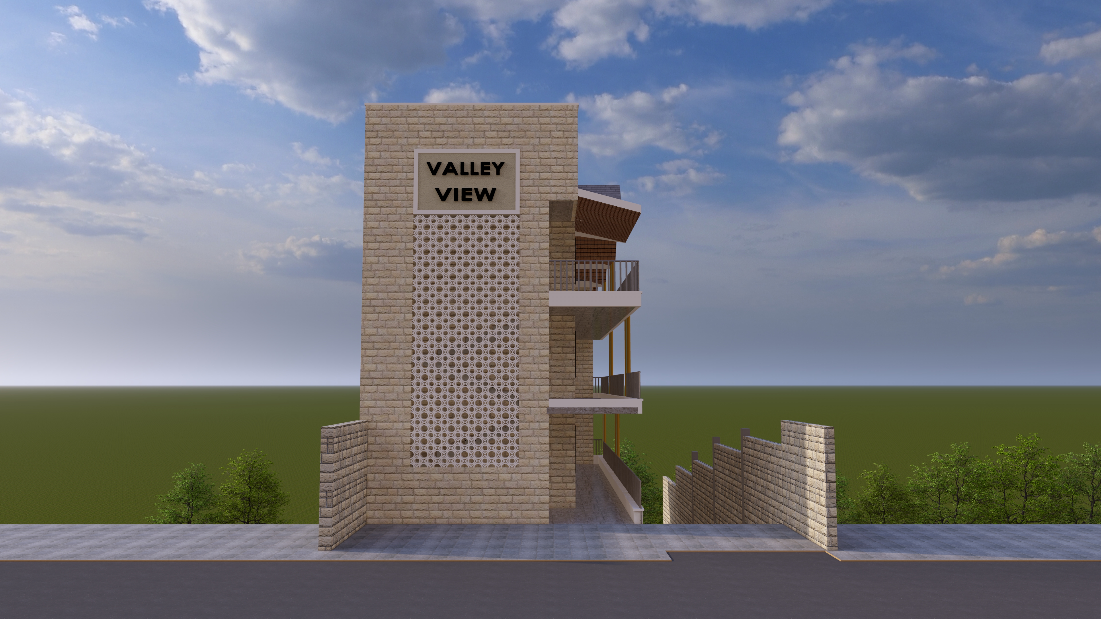 add few trees in background and far background for context and some few vegetation add warm interior lighting dim add only 2 small recessed circular lights above each balcony balconies only they should be evenly and neatly spaced