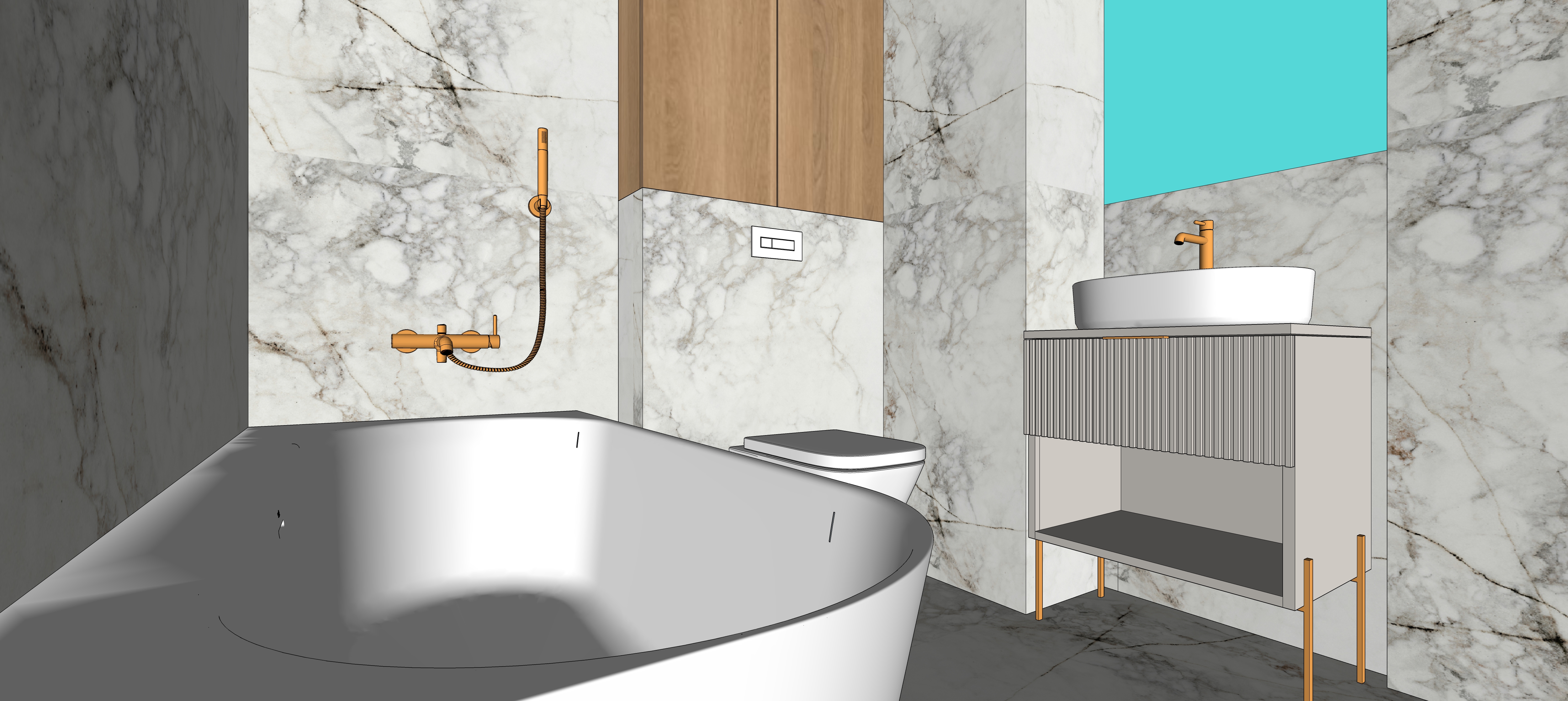 create a photorealistic visualization it will preserve the geometry of all elements the blue area above the mirror is a mirror without any backlighting the yellow orange elements are brushed gold the vanity unit is beige