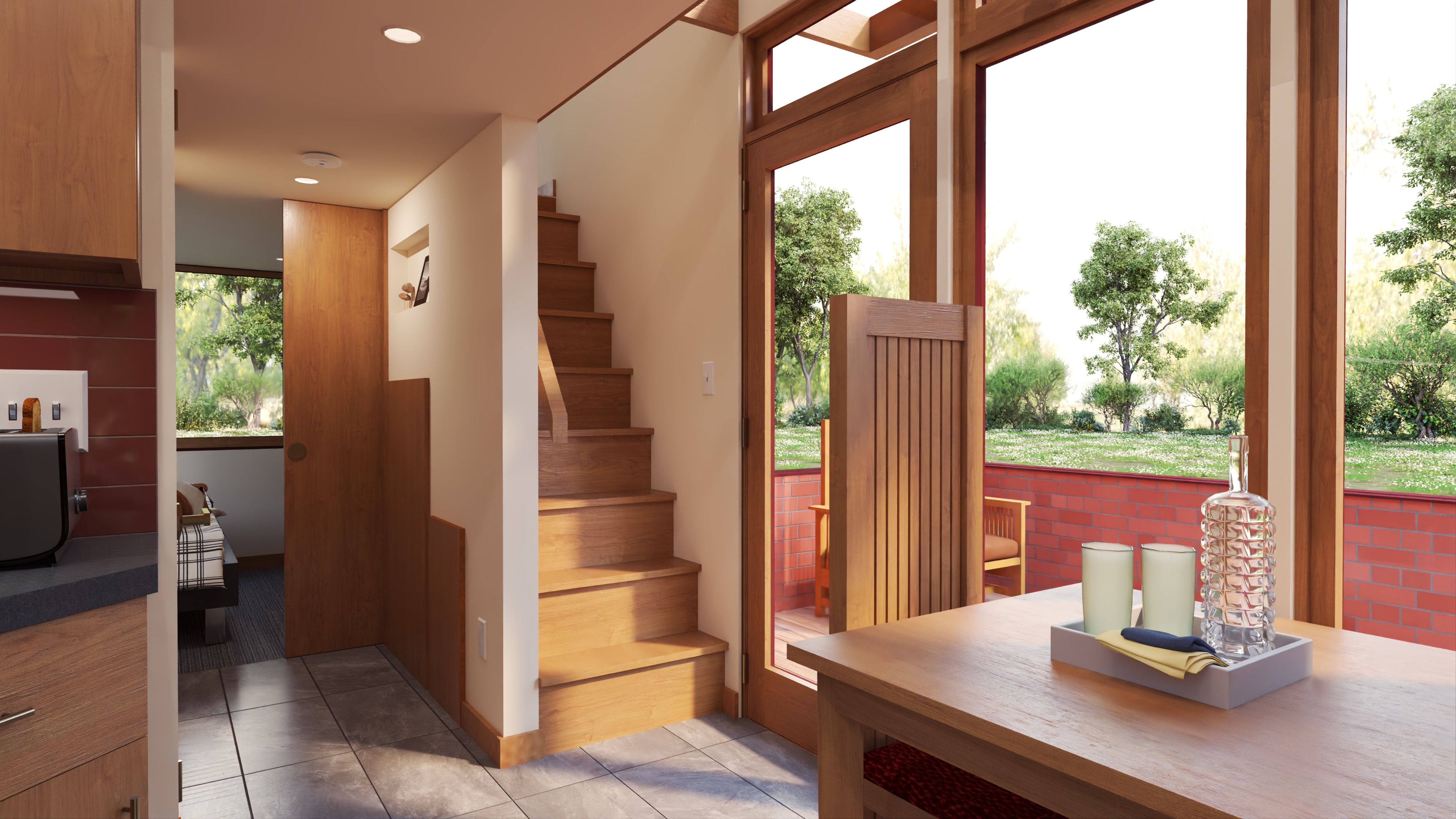 photorealistic interior architectural photography warm natural daylight and illuminated can lights in the ceiling soft directional light with realistic shadow falloff and gentle contrast bright but warm atmosphere realistic global illumination with subtle ambient occlusion in corners and at material transitions dslr with a 35mm lens eye level perspective professional architectural composition and framing and realistic depth slight depth of field foreground and midground in focus background softly flailing off physically based materials throughout with enhanced texture detail natural surface variation and subtle imperfections with realistic sheen high quality windows with realistic thickness subtle reflections of the interior soft exterior reflections and accurate light transmission windows feel transparent exterior visible through windows feels real and grounded with natural daylight realistic trees and landscape interacting with the light warm color temperature balanced with natural daylight soft highlights realistic shadows gentle contrast subtle camera noise natural exposure not overly sharp soften corners and edges professional photography style do not change the geometry of the image