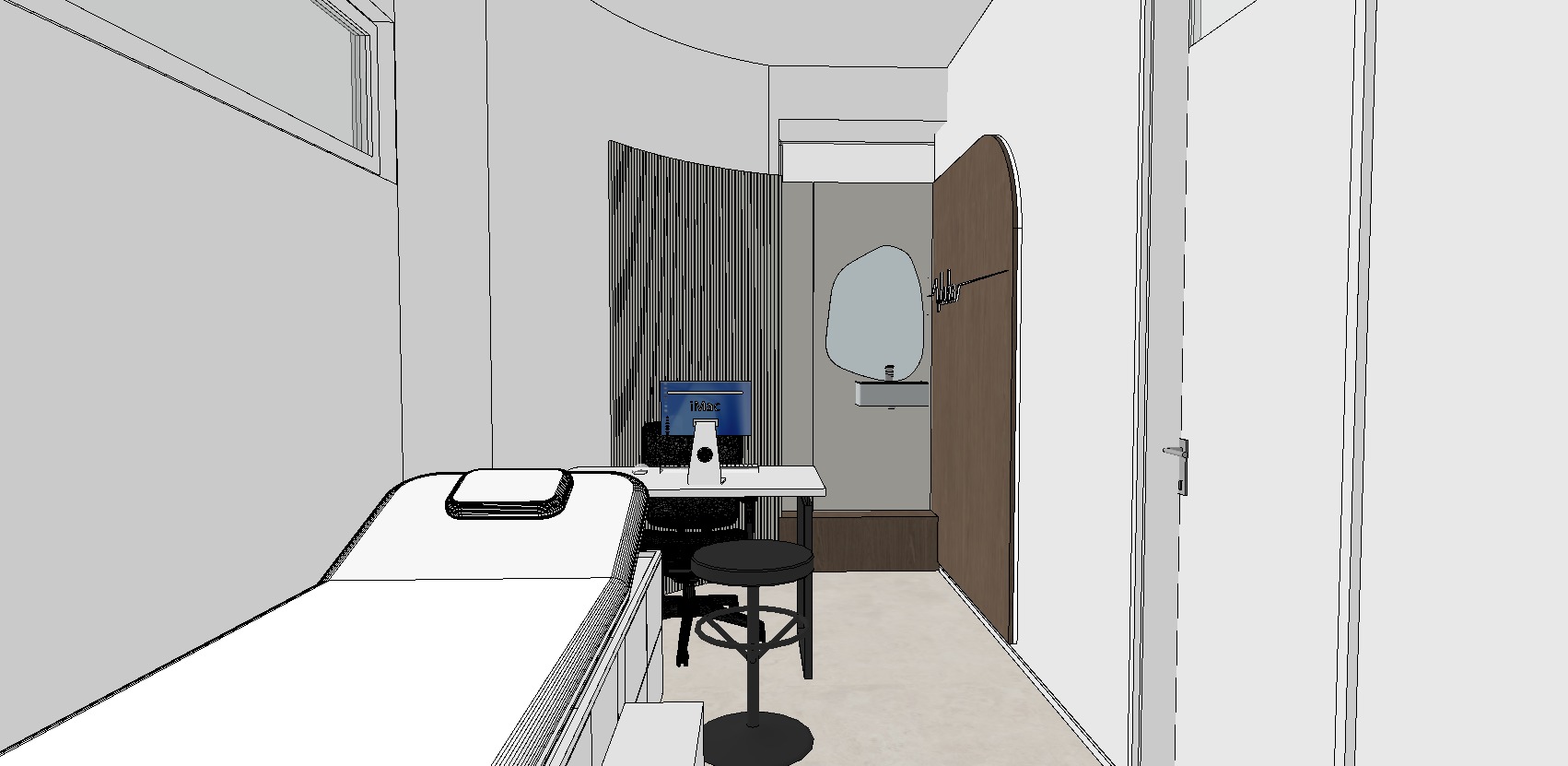 this is a cardiology office and i recommend making a high quality render the ambient light should not be warm but more illuminated with natural light and 4000k light the wood texture should be real put led light behind the wood and the logo should be with led so that it looks clear put some minimal decor on the work table put led lights on the floor with the right side facing the wall and don t change anything the render should be high quality and real also the cream colored panels should look real with high quality textures the sink with the mirror should be real the thin engraved panels are cream colored and there should be no logo or anything just those panels