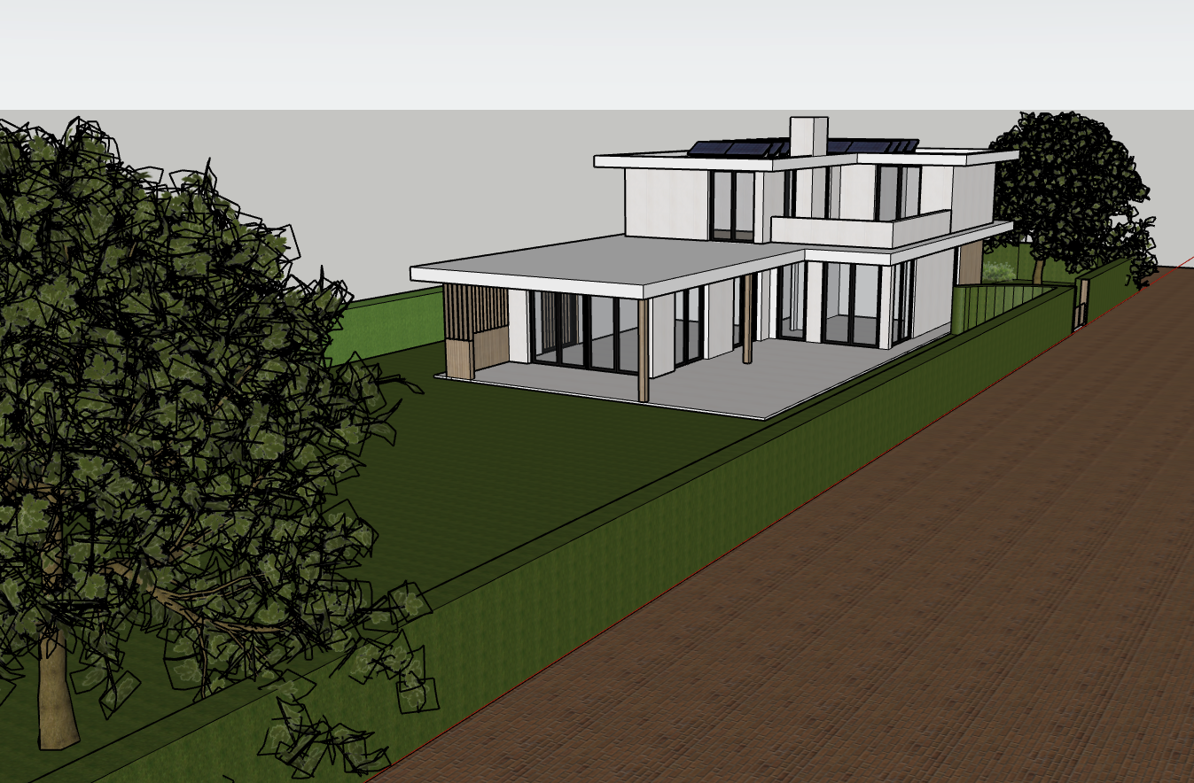 it is a modern minimalist villa with horizontal details there is sedum on the roof the villa is located in the netherlands in a wooded area the garden is surrounded by a hedge and behind the house is a large lawn the garden has a pedunculate oak and a number of scots pines there is a lot of sun and reflection in the windows the design of the house should remain as it is now