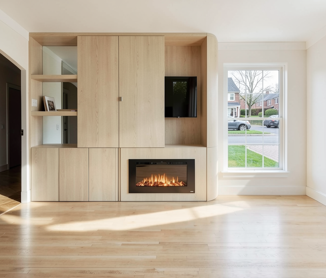 balcony space identical to the reference design preserving exact composition proportions perspective and architectural elements do not modify structure or original materials incorporate lush tropical vegetation including planters dense greenery and cascading plants integrated naturally within the balcony without altering its layout set the scene at sunset golden hour with warm natural light soft shadows and a subtle orange glow enhancing textures and depth maintain realistic materials and a calm atmospheric mood ultra realistic architectural render highly detailed 4k cinematic composition no people no furniture incorporate recessed ceiling spot lighting providing warm focused illumination that highlights architectural elements soft natural light enters from the balcony creating subtle shadows and a calm atmosphere emphasis on material contrast between gray floors and dark wood finishes ultra realistic architectural render highly detailed materials 4k cinematic composition no people