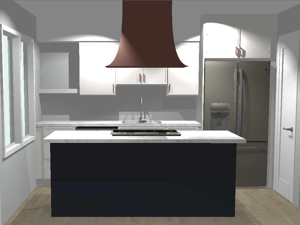 render a lived in kitchen with dark navy blue island cabinets and soft white perimeter cabinets featuring sleek copper handles the backsplash should be an elegant light gray marble smooth and reflective the countertop extends in the same marble adding a touch of luxury the floor is a soft natural wood that complements the cabinets creating a warm and inviting atmosphere soft ambient lighting gently highlights the cabinet details creating a cozy yet sophisticated space with a modern and elegant ambiance