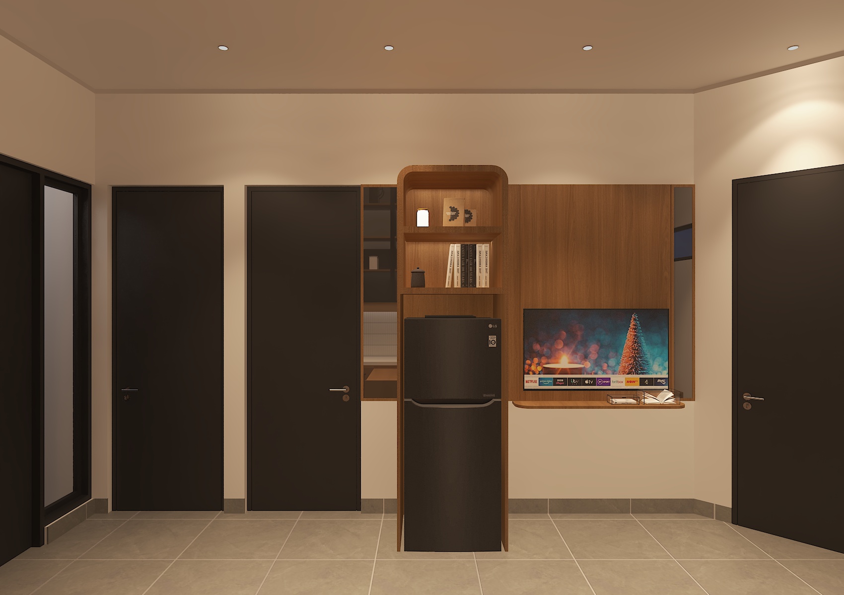 make it into real life photo with very ultra realistic modern style interior with very natural lighting indoor between the door and fridge is gray mirror