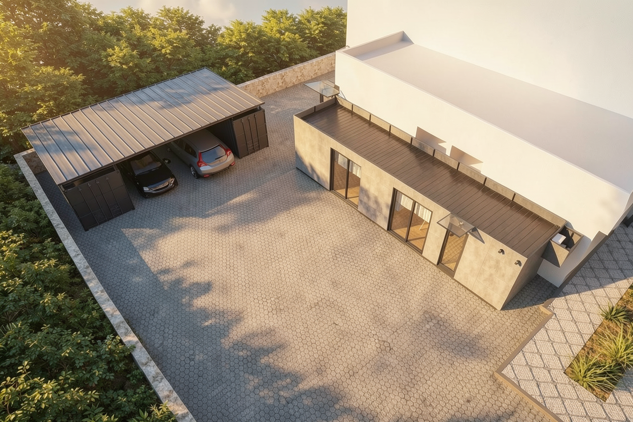 keep everything the same except make the windows black impervia windows with no grid pattern and back the front door have 3 4 glass going down and black door