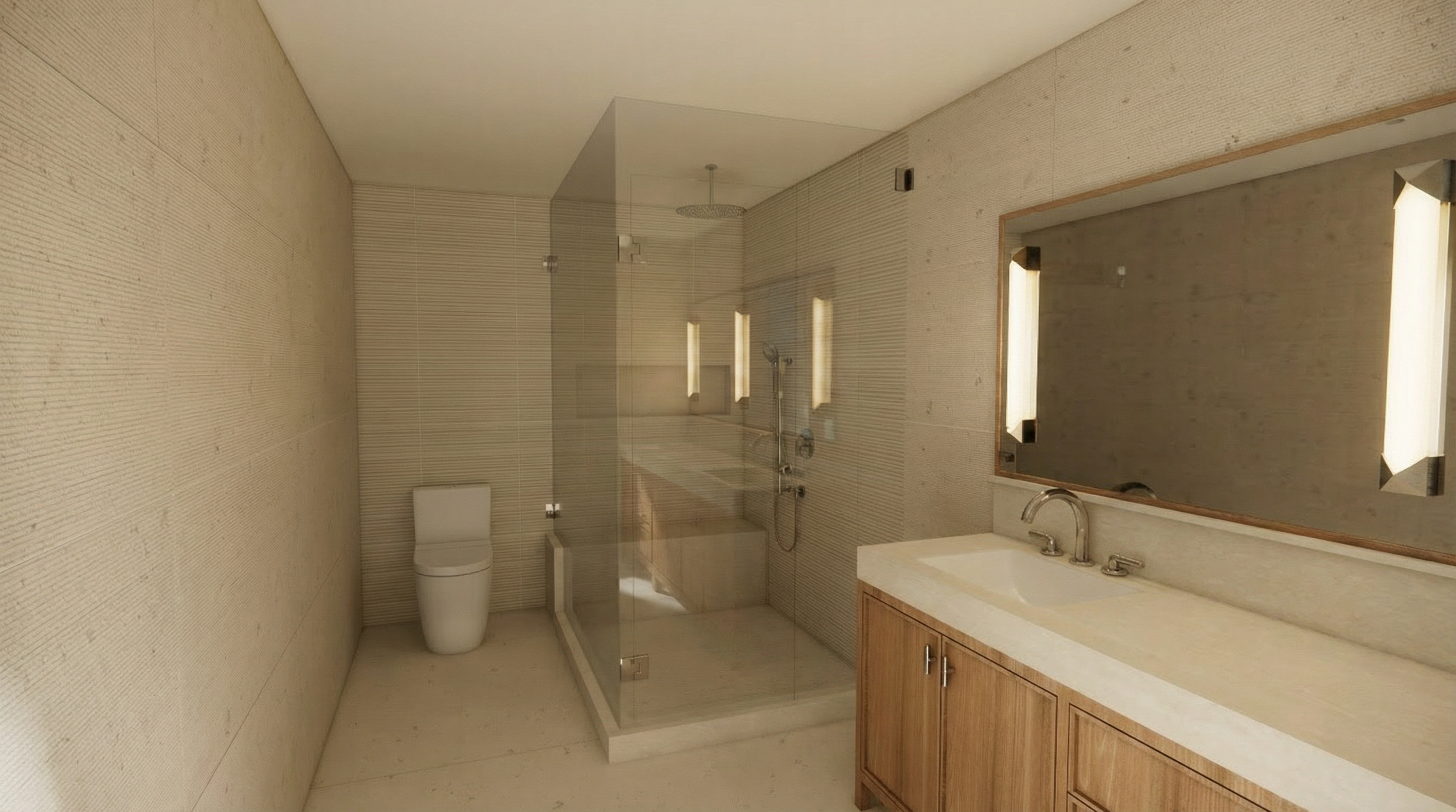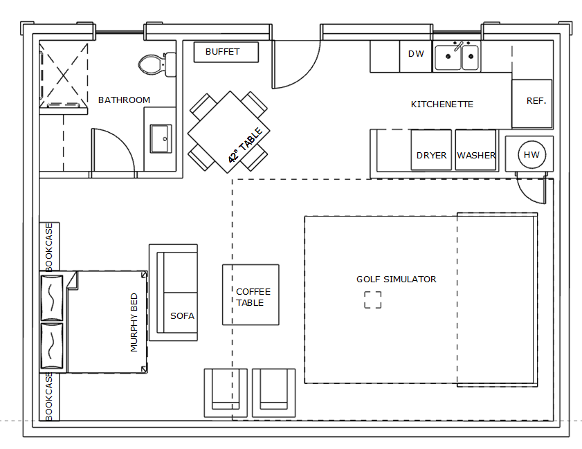 create rendered aerial plan view of cottage apartment in warm neutral palate bathroom has white marble floors kitchenette has white cabinets with white marble countertops and stainless steel appliances white 42 table with upholstered chairs and warm wood buffet only the golf simulator has green turf floors and projection screen at east wall living area bedroom and kitchenette have medium wood flooring living area has white sofa and chairs with colorful accent pillows bedroom space has white king bed with tall bookcases on each side