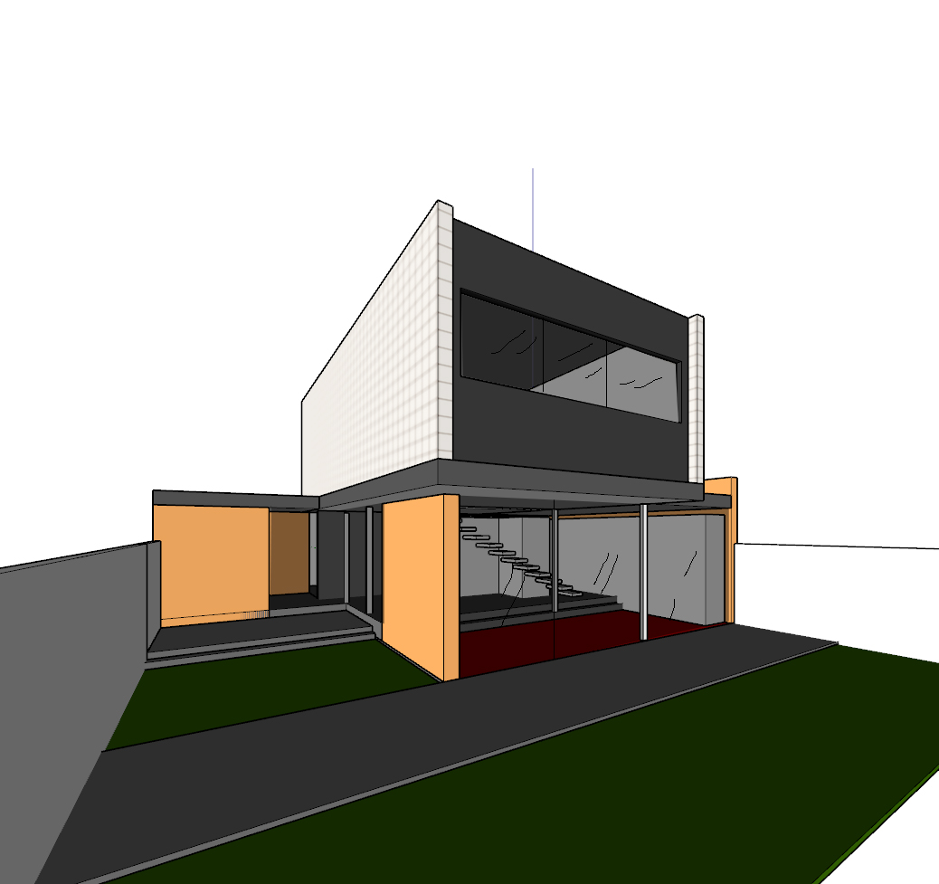 exterior render instructions important do not change or reinterpret the base geometry of the project overall style realistic scandinavian architecture clean composition soft natural daylight neutral tones high material accuracy architecture materials ground floor walls white brick masonry exterior paving grey reference areas concrete pavers exterior landscape green reference areas dry garden with ornamental grasses and one small jacaranda tree placed naturally left side on the upper platform above the stairs and before the main volume outdoor table with chairs ground floor windows black pvc frames with realistic glass reflections interior flooring red reference areas reference image only not the color light natural wood flooring boards oriented lengthwise toward the camera interior flooring grey reference areas reference image only not the color polished concrete floor with visible stone aggregate lightly vitrified finish light grey tone interior ceiling and exterior eaves white painted wooden boards boards oriented lengthwise toward the camera perimeter beam between lower and upper volumes black steel beam c shaped profile with the flange visible on the exterior side upper volume lateral fa ades blue reference areas reference image only not the color white ceramic tiles 15 15 cm upper volume front fa ade black finish with a metal planter box below the window containing small plants context behind the perimeter fence include neighboring house roofs and surrounding trees lighting rendering soft daylight overcast or diffused sun realistic shadows and reflections architectural photography feel scandinavian realism calm and minimal atmosphere