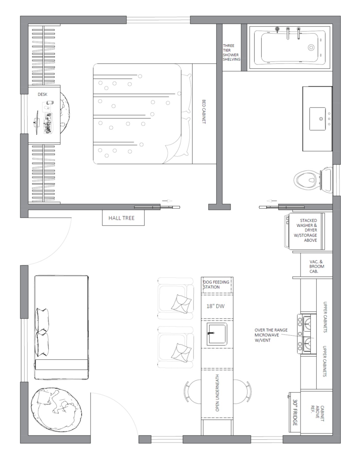 convert this floor plan into a realistic isometric 3d view of a full house show the space from an elevated angle with furniture walls and details visible replace dog bed with a potted plant and make sofa dark blue and comfy use the same furniture as shows on the plan do not change the orientation of the floorplan