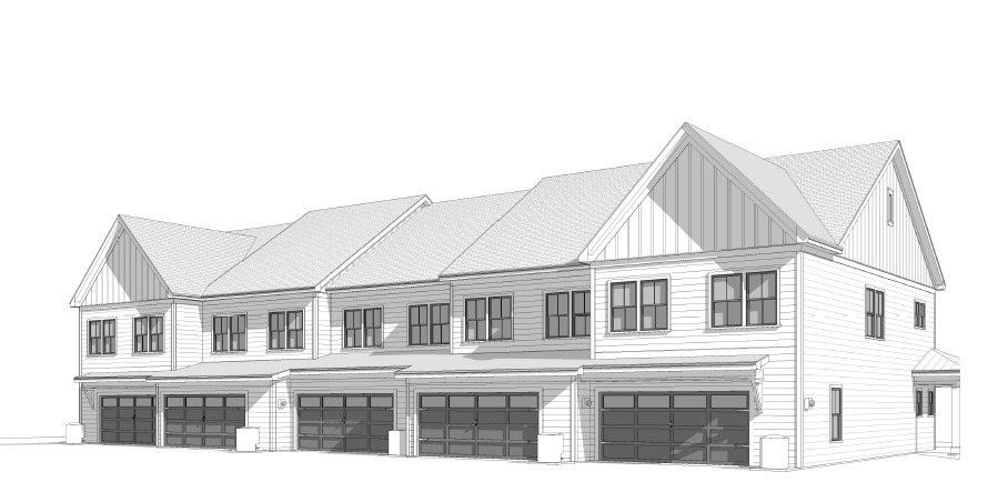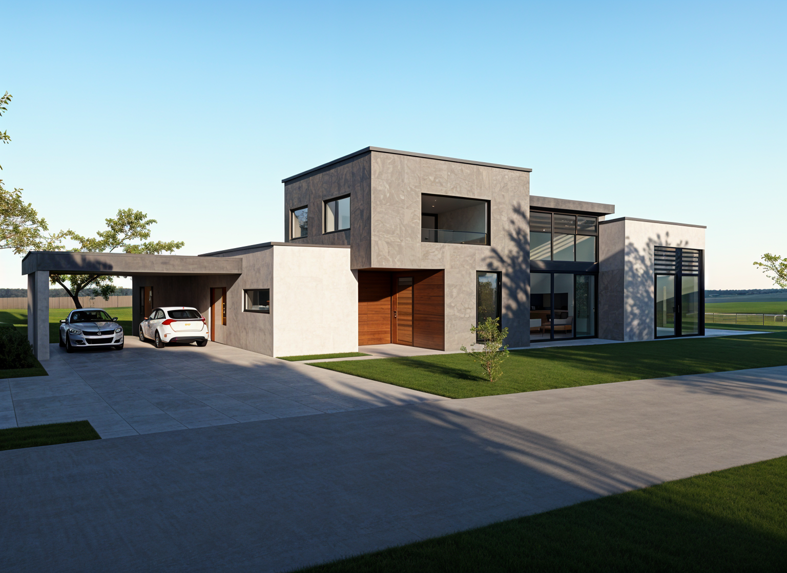 modernist wide angle shot black roof white paint black garage doors architecture