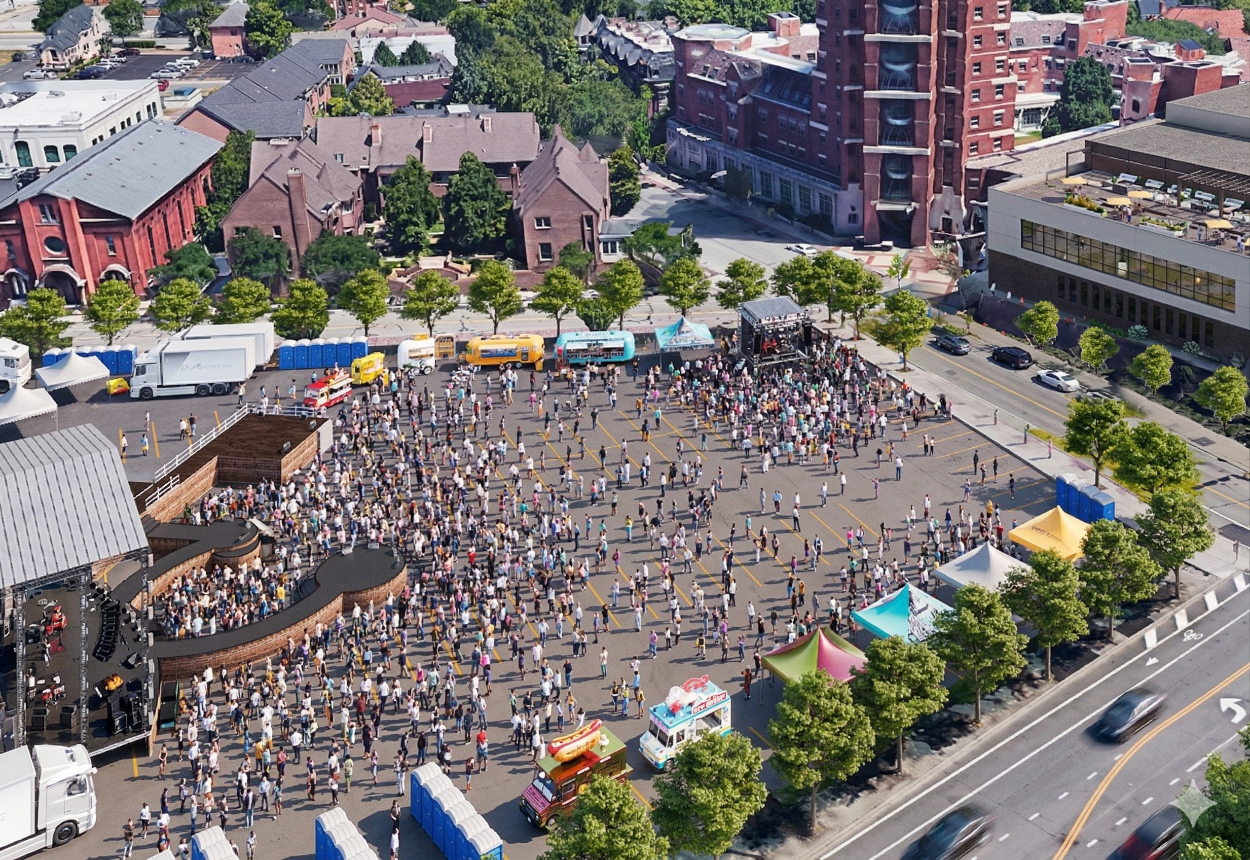 exterior shot aerial view of a vibrant outdoor festival in a bustling city neighborhood the festival ground is filled with a lively crowd colorful tents and food trucks the tents come in bright shades of turquoise yellow and pink the food trucks feature eye catching colors like bright yellow and cyan surrounding the festival are lush green trees lining the streets which add a natural touch to the urban setting the buildings in the background are composed of classic red brick giving a sense of historic charm the atmosphere is lively and energetic with people enjoying the festivities under a clear blue sky architecture