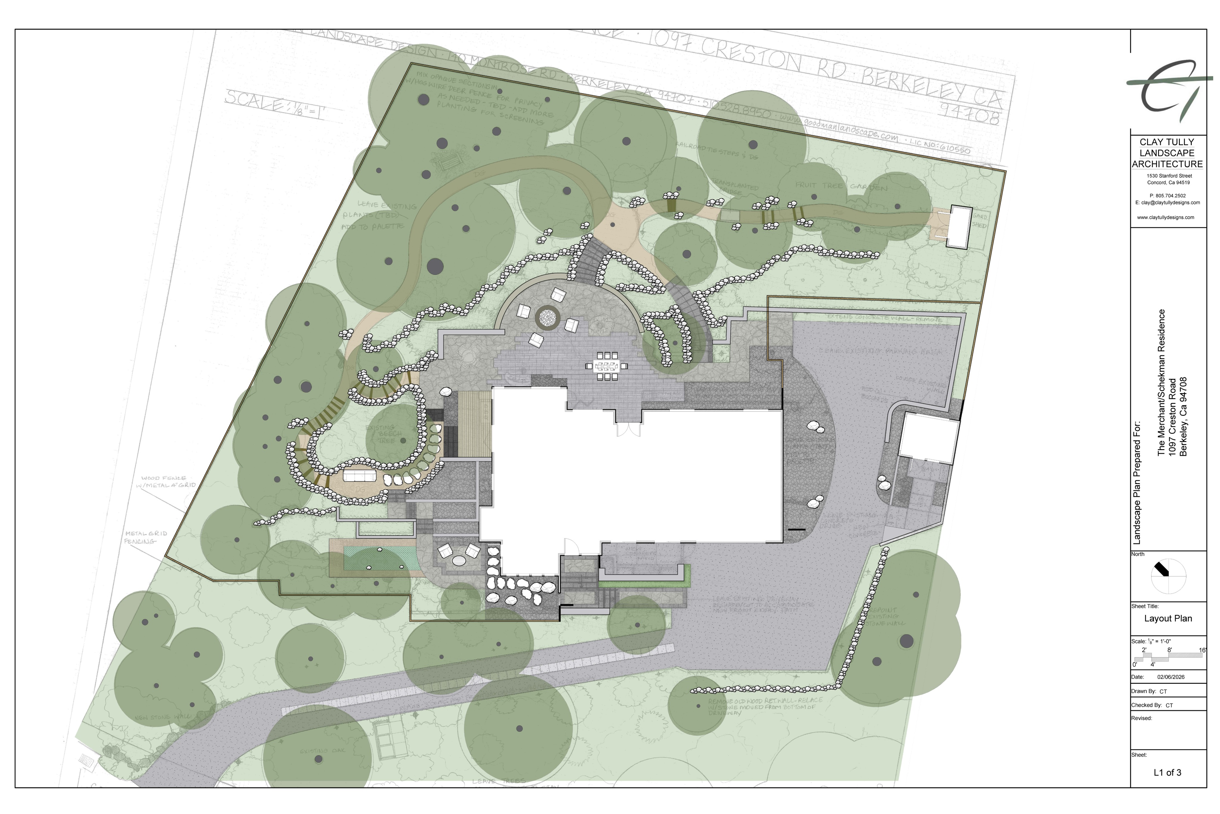 core style prompt use as a base convert this landscape plan into a professional hand rendered illustrative site plan top down aerial view watercolor and colored pencil style with lush realistic tree canopies casting soft shadows varied green tones warm earth toned pathways and detailed plantings architectural illustration style for the tree planting detail render trees from above with realistic circular canopies multiple shades of green soft drop shadows beneath each canopy visible texture variation between deciduous shrubs ornamental trees and ground cover masses for the hardscape paths patio blue stone pathways rendered in warm greys and sandstone tones showing individual paver texture with slight color variation and aged character patio surface shown in light gray concrete with subtle shadow lines for the overall polish professional landscape architecture presentation drawing illustrator photoshop style high contrast between built elements and soft plantings white background clean property boundary seasonal color accents including warm oranges yellows and reds among the greenery
