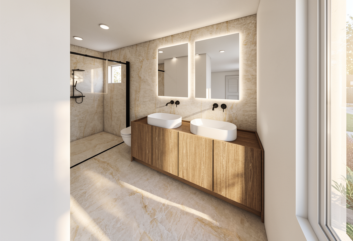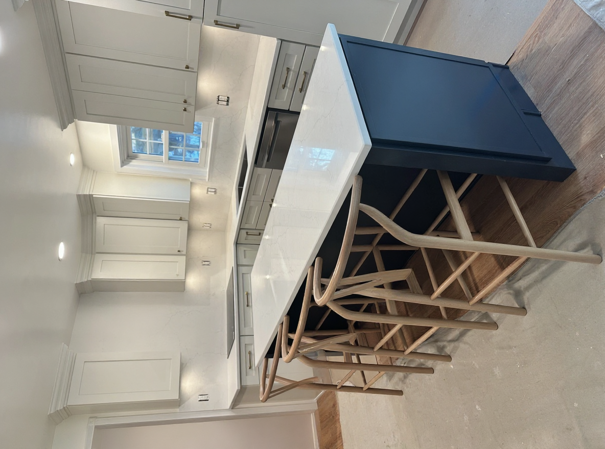 crop out the stove and gas pipes on the left side crop out the drop cloths on the fireplace in the back of the room add stained wood shelving to the open areas paint the unpainted areas white on the cabinets stain the mantle with the same color as the shelving put white trim around the fireplace insert add furniture in the room a sectional couch and two reclining chairs in neutral fabric in front of the windows with a table in between add a rug and a sofa table add minimal accessories a tv above the fireplace mantle and double rod curtains with a sheer underneath and a printed fabric on the outer layer flip the room 180 degrees and change the windows to behind the recliners show the view facing the fireplace and make the couch an l shaped sectional use the exact same furniture and the same view and put the 2 chairs in front of the windows and the sectional on the right side of the room make the sectional bigger