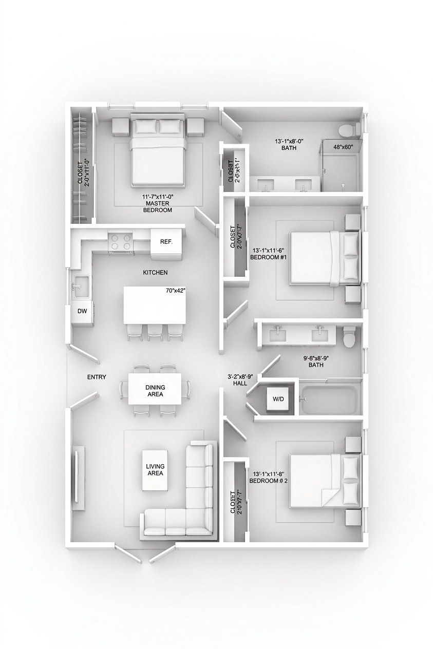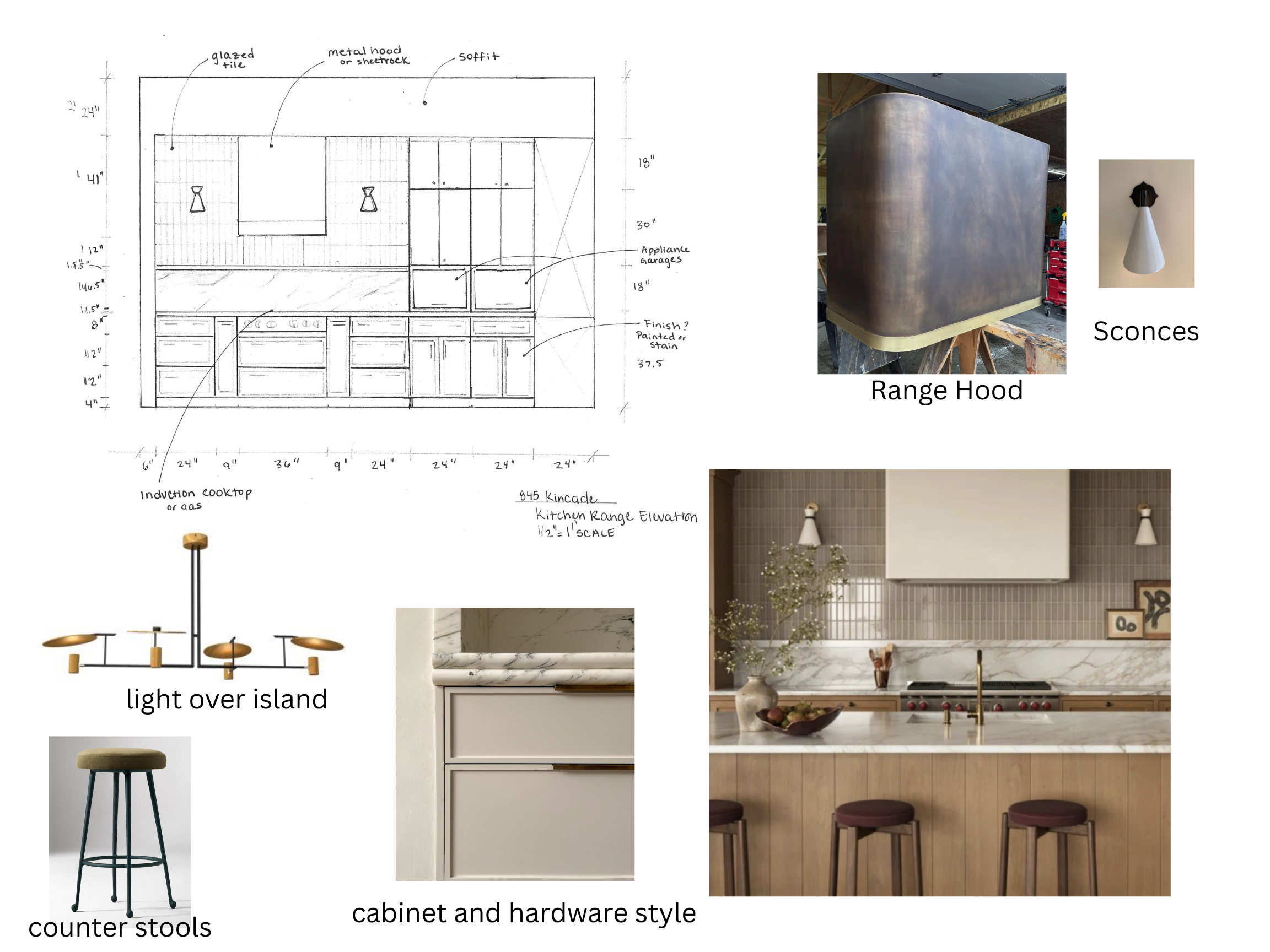 create a modern kitchen design featuring a neutral color palette with hardwick white farrow and ball cabinets the cabinets should have a light beige matte finish with sleek modern hardware the range hood is a polished bronze with a soft curved form for a sophisticated touch include sconces in a soft white with aged brass fixtures for ambient lighting for the backsplash use glossy light brown rectangular tiles the countertops are white marble with subtle gray veining integrate bronze or brass fixtures for the faucet and other hardware the atmosphere is warm and inviting with soft ambient lighting enhancing the elegant simplicity of the space the kitchen island is white oak with walnut stain the floors are a warm white oak