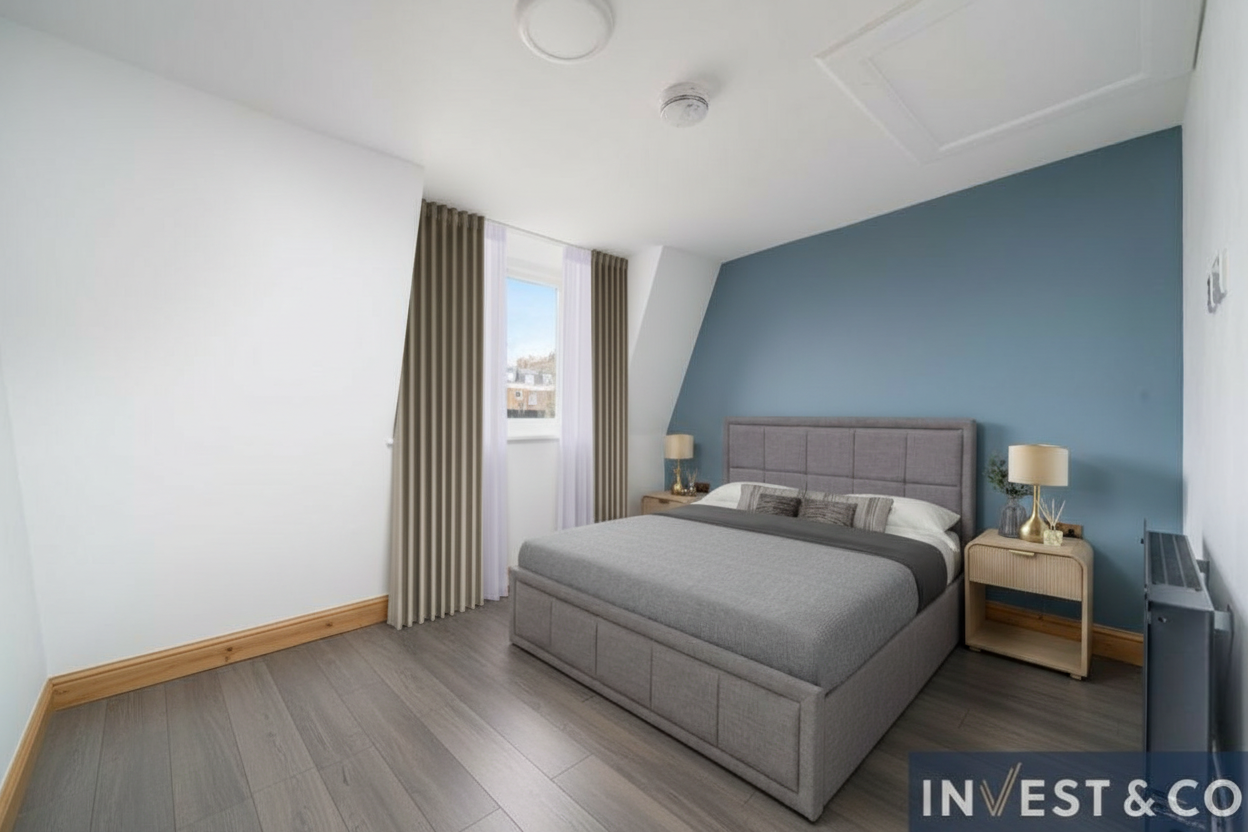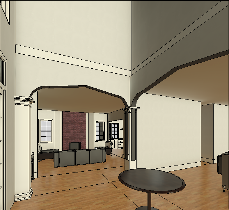 realistic image white painted panels on upper walls and columns rug centered under table add vase with flowers to table decorative white wood mantel over the brick with fire lit add colorful painting above fireplace center the flowers on the table center the rug under the table