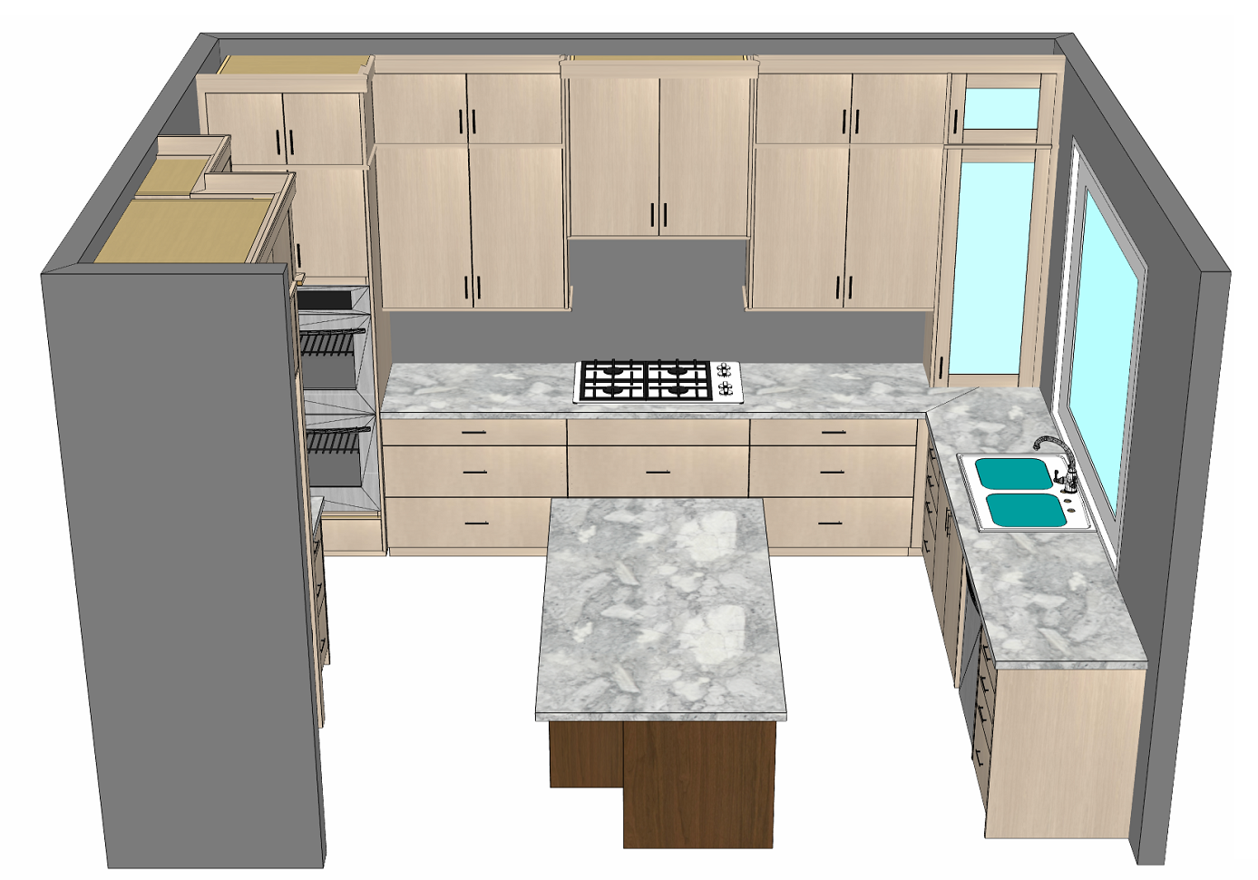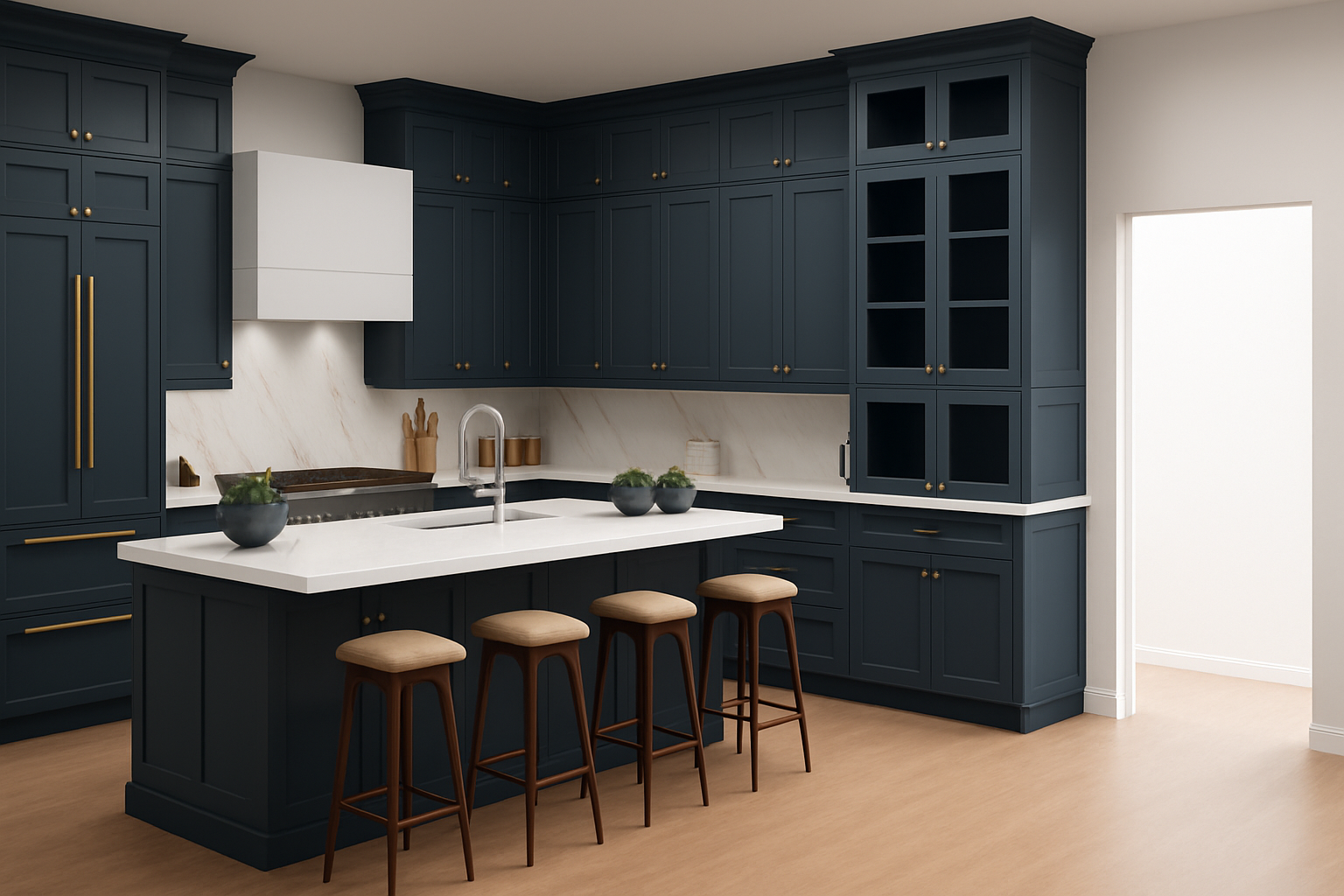 do not change the cabinets in any way preserve the exact cabinet colors materials finishes dimensions door and drawer styles hardware spacing alignment and all geometry exactly as shown do not alter the countertop shape backsplash appliances flooring lighting fixtures or wall structure only remove the construction materials clutter and mess from the scene clean the room and make it look finished and staged add a few simple tasteful home accessories appropriate for the style of the space but do not add or remove any furniture windows or architectural elements maintain the original lighting direction and realism enhance clarity and polish the photo while keeping the cabinetry and room design completely unchanged do not alter the lighting to keep the cabinet colors as they are in the image do not add any lighting to any of the cabinets