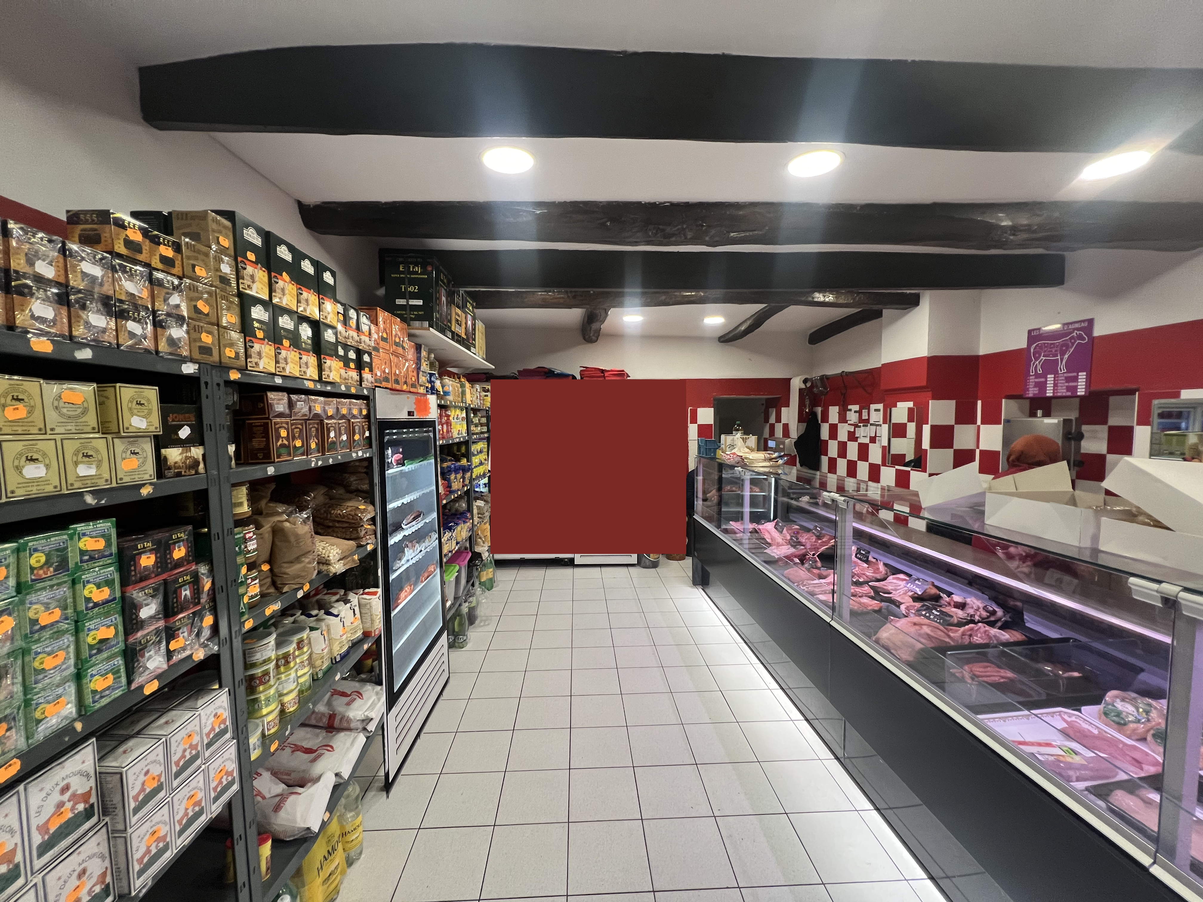 wood shelves on the left with fridge in the middle wood shelves on the left black wall everywhere wood floor all black tiles on the wall instead of red and white