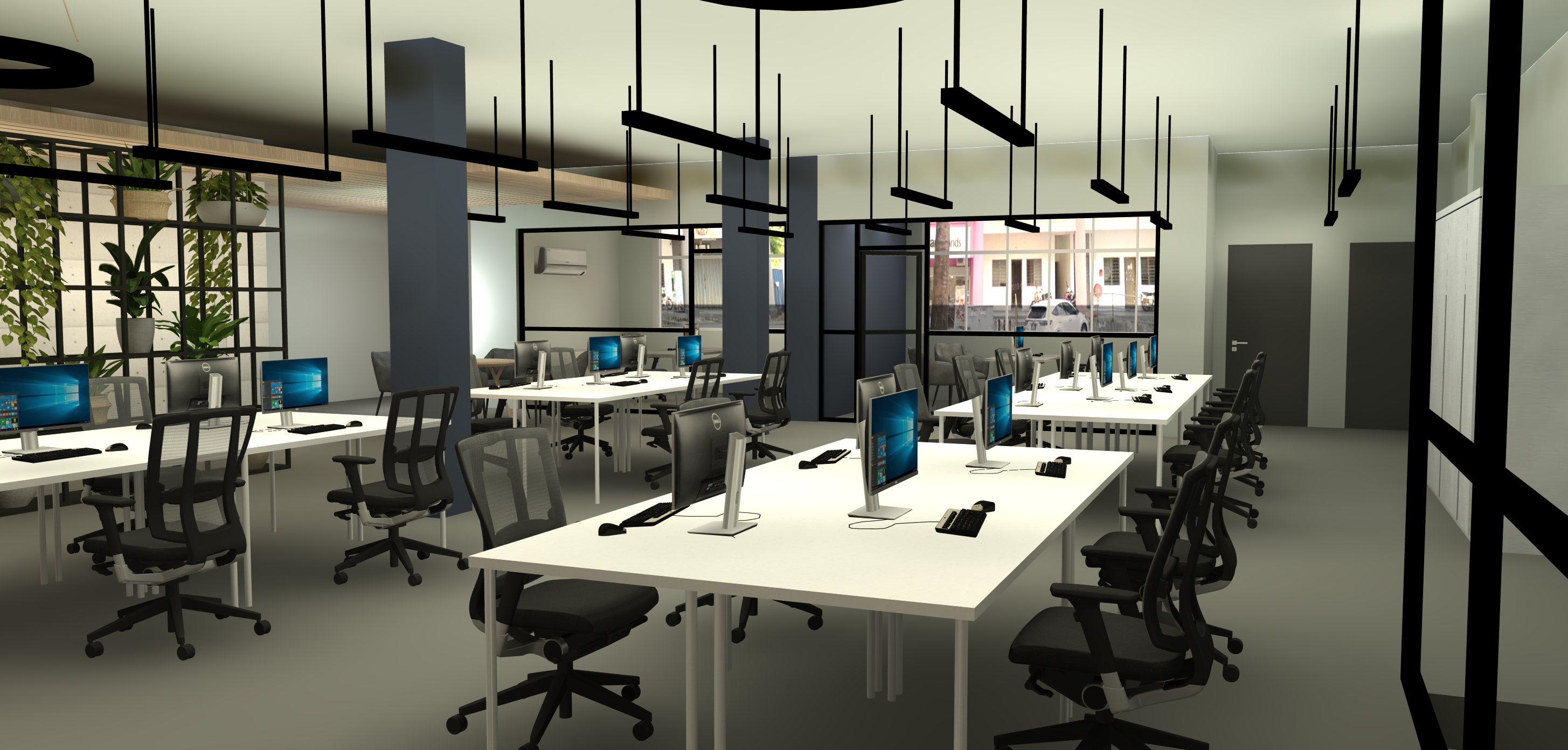 ultra realistic interior render of a modern open plan office with clean architectural lines and contemporary furniture enhance overall realism through accurate lighting behavior material response and spatial depth replace the exterior visible through all windows with a realistic small town backdrop viewed from a first floor perspective show low rise buildings shopfronts residential facades parked cars sidewalks and subtle greenery the town view should feel calm and everyday not urban or high rise and should be slightly softened by window glass reflections and atmospheric perspective so it remains secondary to the interior ceiling mounted linear pendant lights are turned on and actively emitting light fixtures cast soft realistic downward illumination onto desks and circulation areas with visible light falloff subtle glow on the fixtures and gentle shadow definition beneath desks and chairs lighting should feel balanced and professional not harsh or over bright maintain a mix of soft natural daylight and artificial lighting daylight from windows is diffused and controlled avoiding overexposed highlights while interior lighting provides even ambient and task illumination interior materials rendered with high realism matte walls and columns with subtle texture smooth white worktables with soft reflections realistic office chairs with fabric mesh detail computer monitors with gentle screen glow and polished flooring with natural roughness glass partitions and window frames show realistic thickness transparency and reflections physically accurate global illumination ambient occlusion neutral white balance calm professional atmosphere eye level camera 35mm lens full frame dslr look photorealistic architectural visualization quality 8k resolution no stylization no cgi look