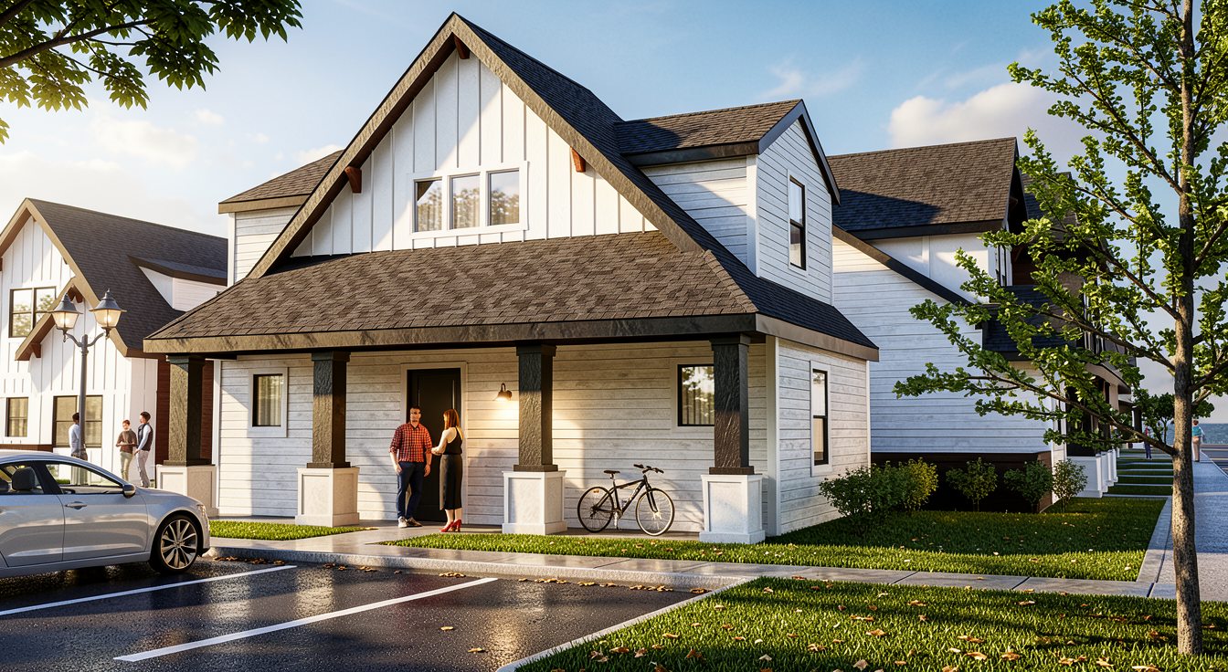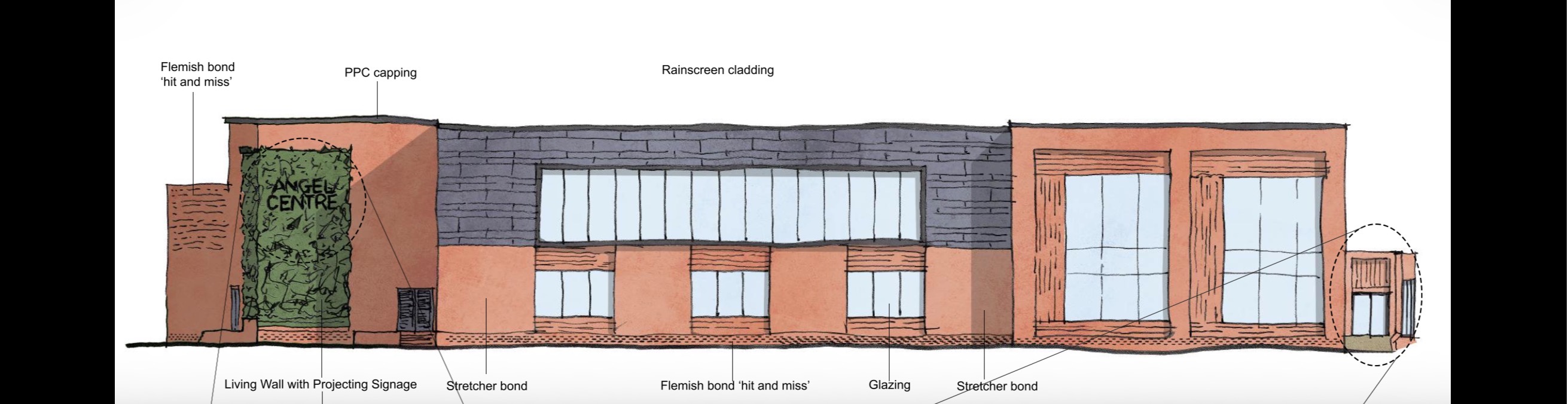 create a beautiful architectural rendering of a contemporary building use warm terracotta for the brick walls with a flemish bond pattern and illustrate the ppc capping with a sleek black finish highlight the rainscreen cladding with deep gray tones depict large reflective windows using soft blue hues to show glazing set a lush vibrant green living wall with a projecting sign that reads angel centre convey a sunny inviting atmosphere with soft natural lighting and clear skies