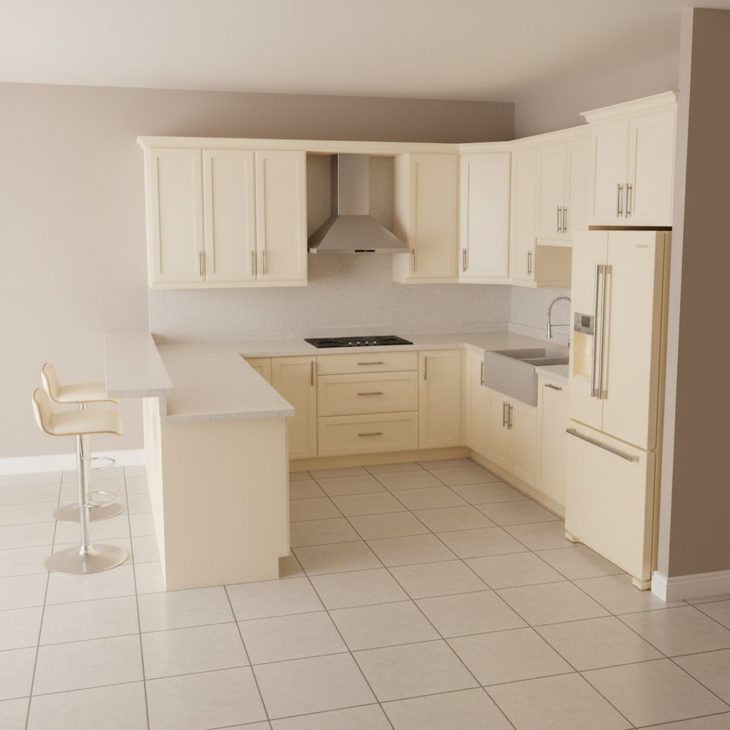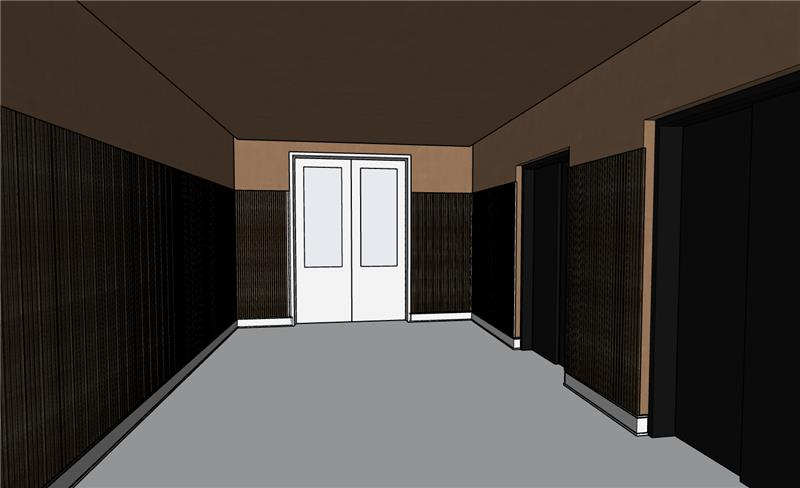 apply style of reference image to input image output should be a high end elevator lobby with ribbed wainscot plaster ceilings and light warm gray brick laid tile floor maintain proportions of input image add indirect cove lighting around perimeter of ceiling