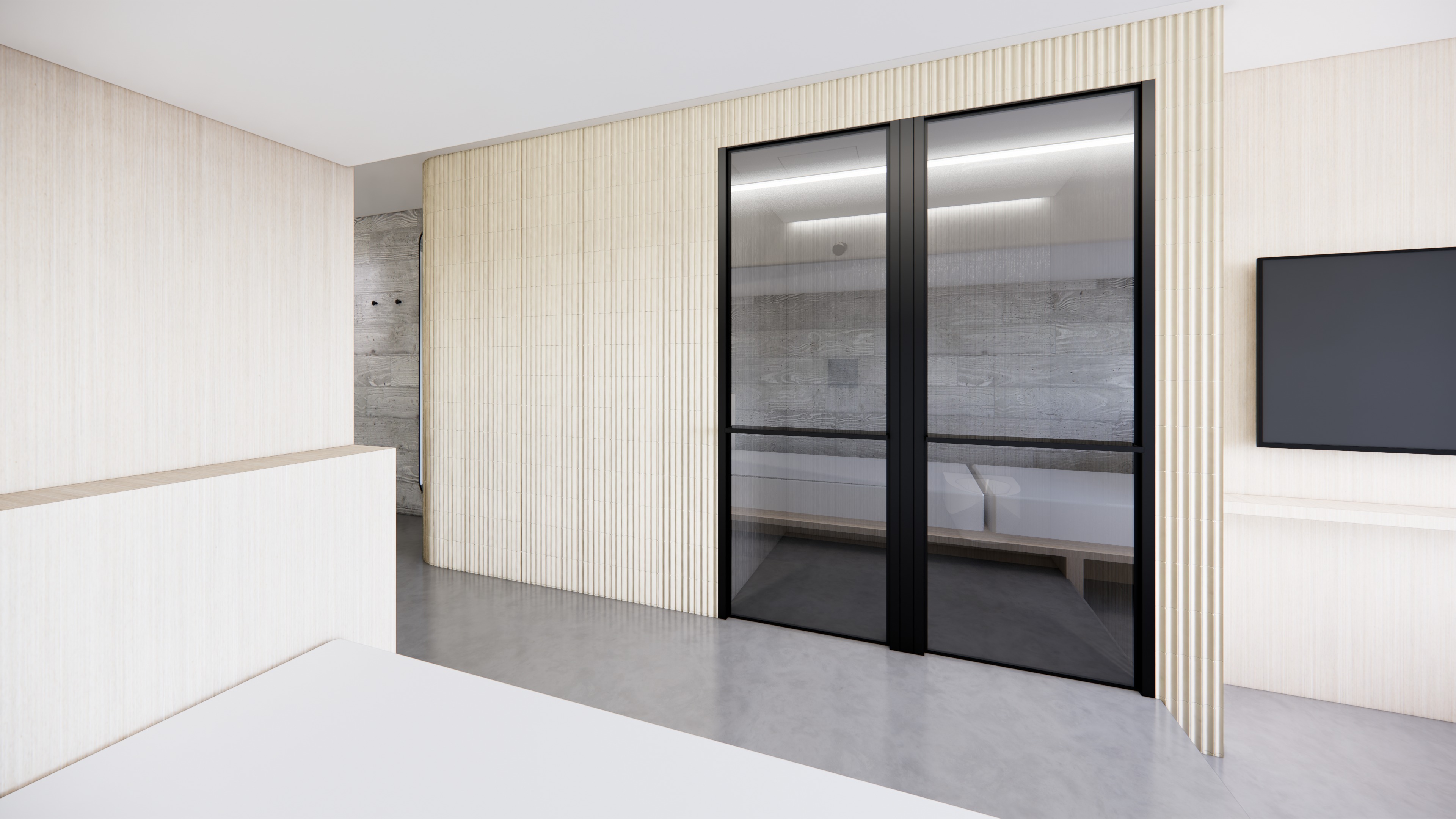 polished concrete floor white oak wood wall paneling teal bedding with white pillows fluted limestone wall tile include tile around curved wall keep wood behind tv keep board formed concrete walls