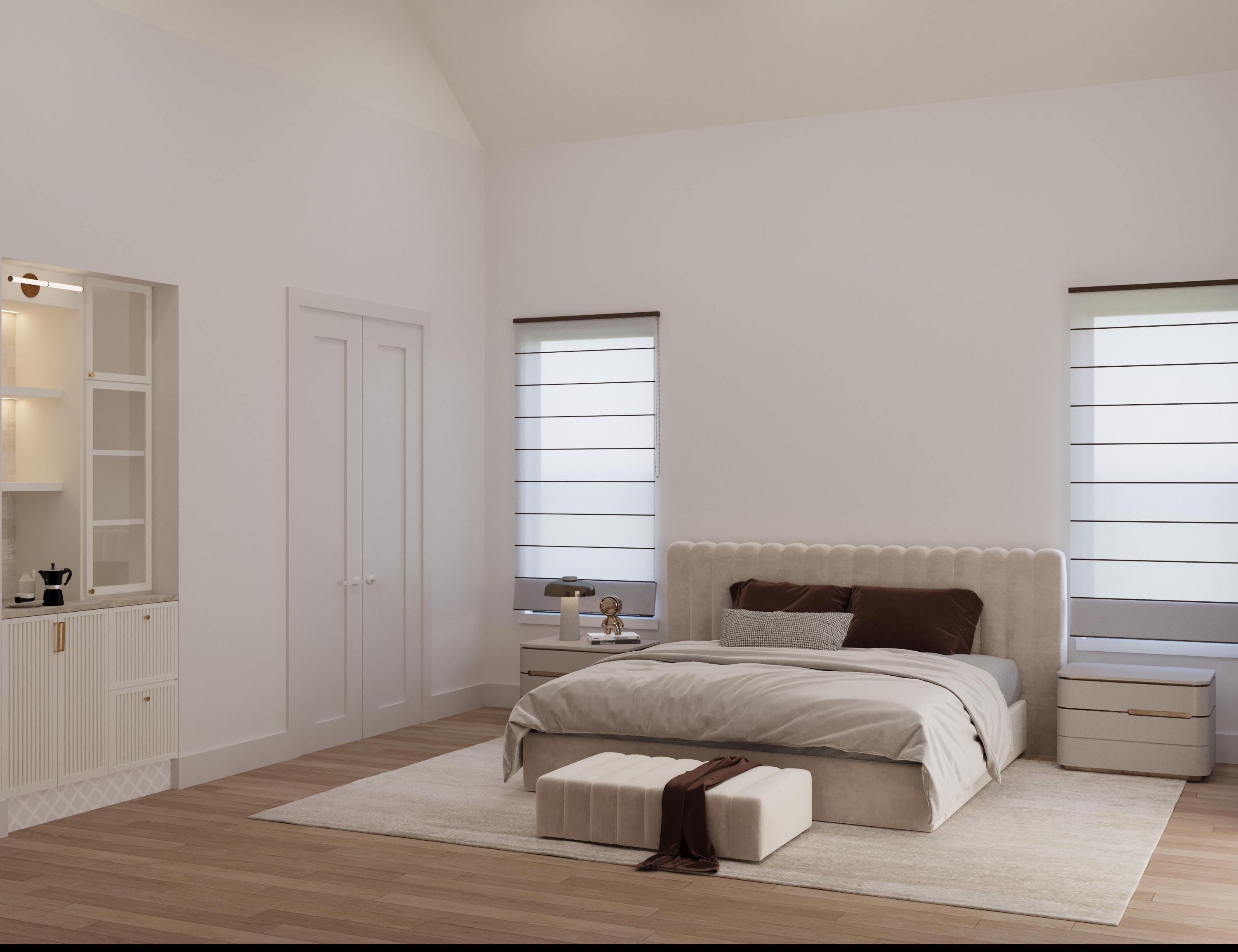 make this a bit more cohesive and minimalistic but chic and change the blinds to curtains keep overall design the same