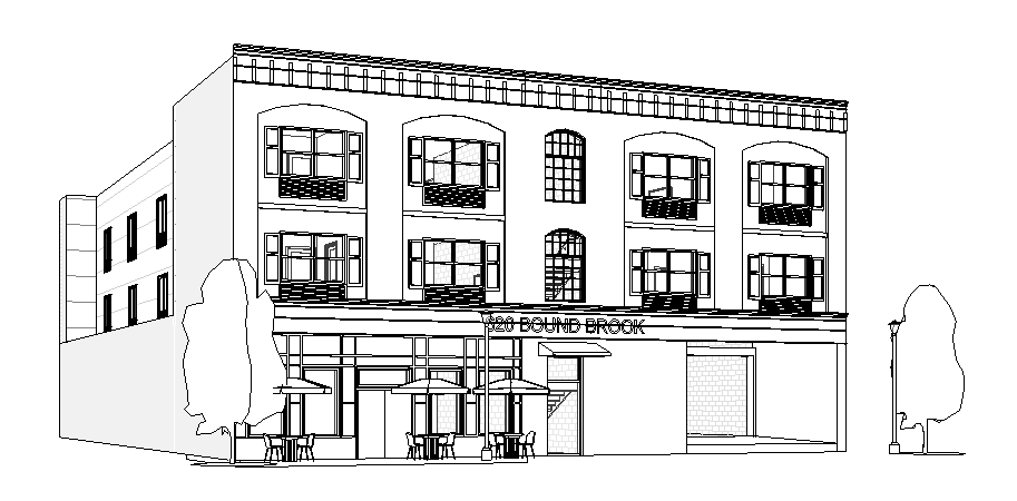 a three story mixed use brick building located mid block not a corner property red brown brick fa ade with evenly spaced arched window headers black steel framed windows and traditional black shutters upper floors feature symmetrical window layout with decorative cast iron grilles beneath ground floor includes a full height glass storefront restaurant with a recessed entry door black metal awnings and green caf umbrellas shading outdoor tables add subtle classical detailing such as brick arches and horizontal limestone bands render in a clean modern urban streetscape with buildings on both sides soft morning light realistic shadows crisp materials and ultra photorealistic architectural quality straight on elevation view with no distortion