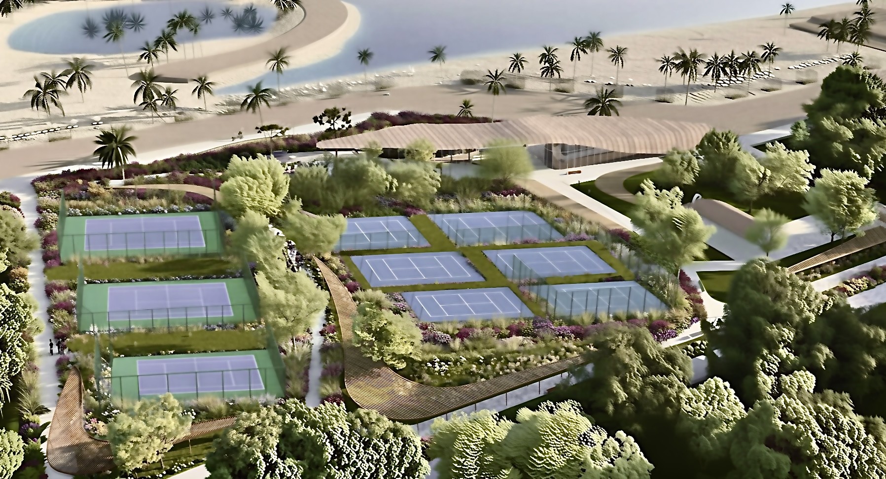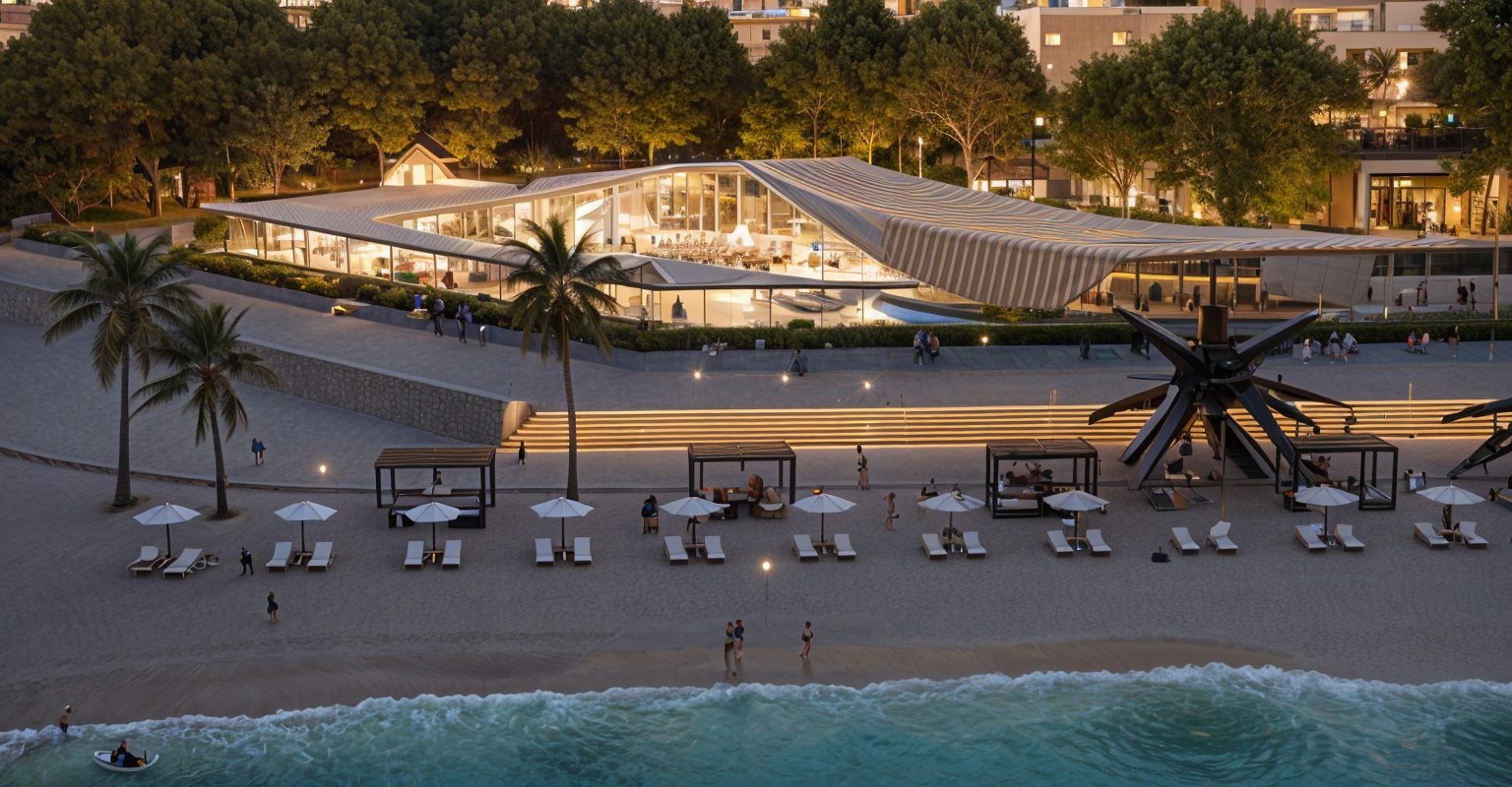 night view with intrestin lighitng in the same image the same with exactly waves lines form in roof style architect s elements and composition add in the same landscape better and qualificator elements beach umbrellas minimal yachts marine better vegetation and benches and roof from copper warm metal mirror effect stripes view with the same roof with texture from glossy copper metal mirror effect in curves stripes add more and more people in the square of roof building restaurant and more beaches people in sais longs atmosphere golden hour athens riviera weather and another yachts maximising the audience clients in peogect