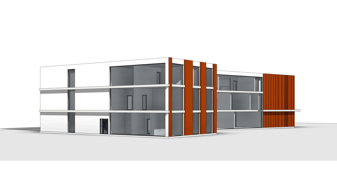 use my uploaded building model as an absolute base strict rules do not change building geometry do not modify massing do not change proportions do not move add or remove windows do not alter the diagonal element do not redesign the volume only change facade materials and lighting keep exact shape and structure from my model facade style modern scandinavian minimalism vertical wooden lamellas in natural oak and accents with facade panels red pepper tone large transparent glazing with thin dark aluminum frames ground floor transparent glass upper floors alternate glass and solid panels add subtle led strip along roof edge warm interior lighting sunset clean flat roof edge environment minimal urban context camera keep same camera angle and perspective as original model no reinterpretation