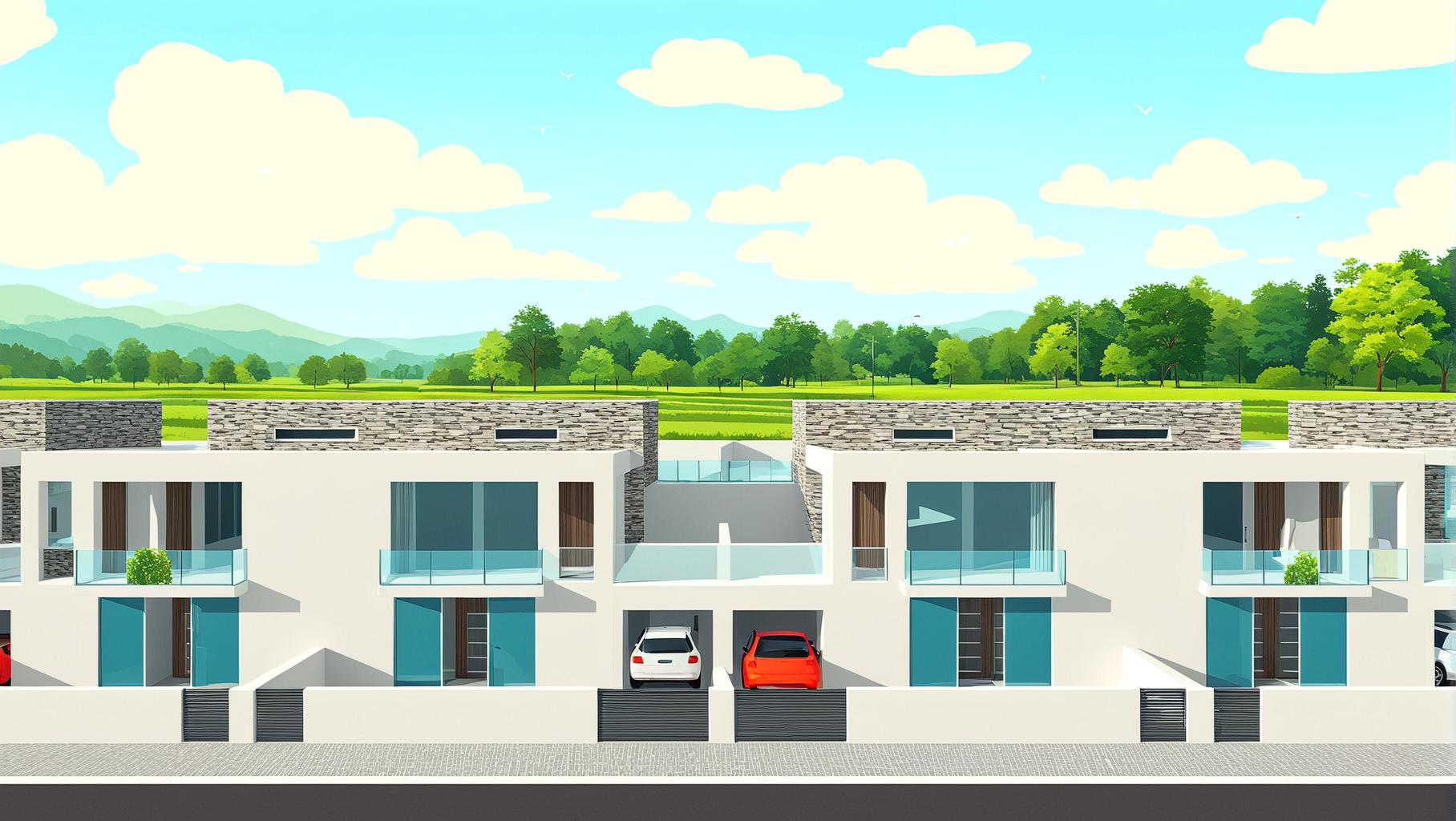 modern townhouse complex sleek white walls stone accents in warm earth tones glass balconies with a touch of teal vibrant green landscaping polished black asphalt road surrounded by lush greenery and distant mountains under a clear blue sky creating a serene and contemporary atmosphere