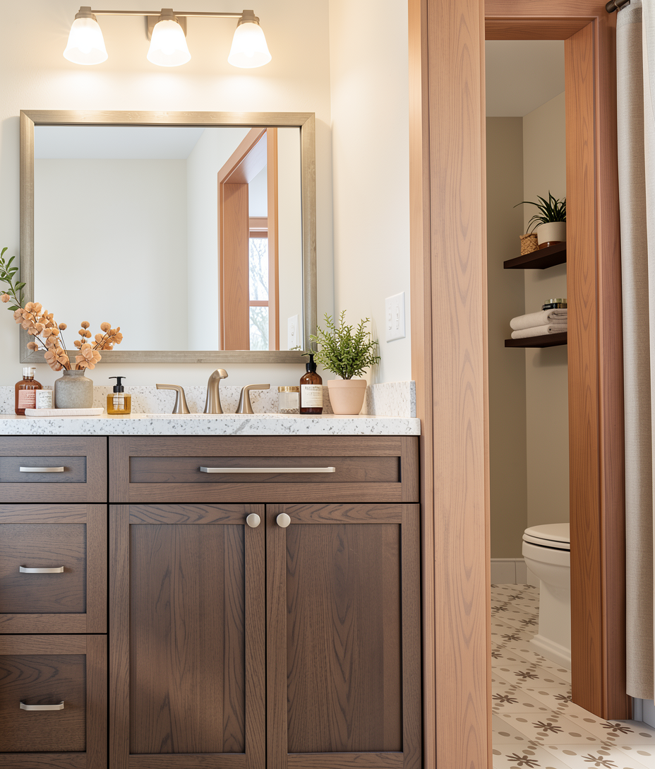 lightly accessorize this bathroom do not add new fixtures or change finishes do not change the vanity countertop