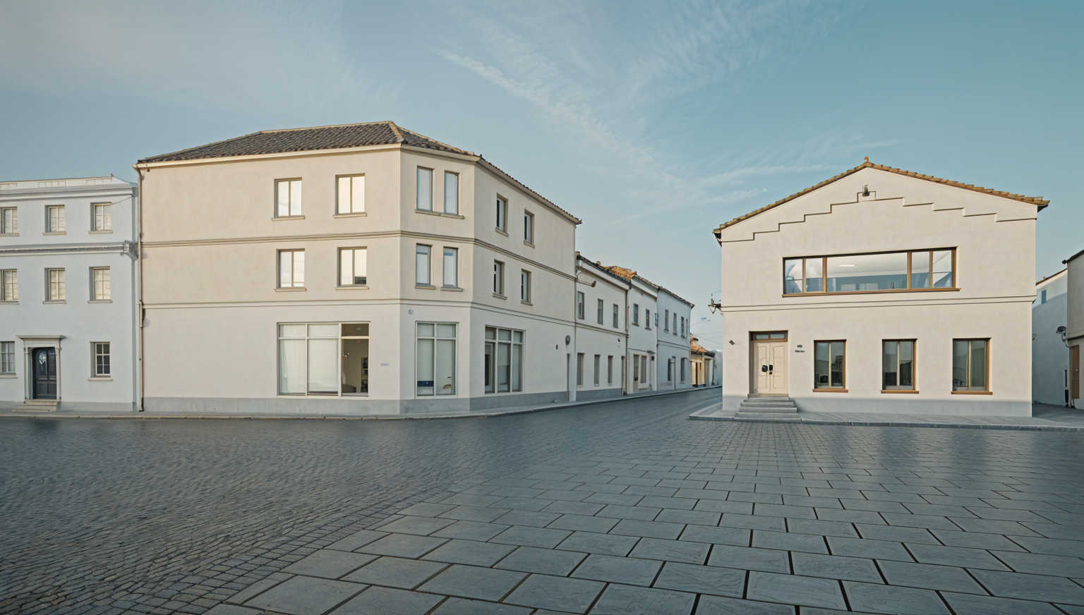 two central windows top right are one big window door right is higher with some steps