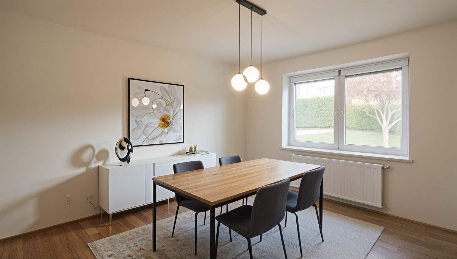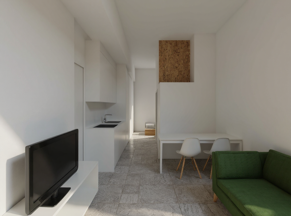 the rendering of the image is very realistic with creamy white walls and ceilings ice green marble pattern pvc panels with gold line grout and slightly recessed panels using wood material spc canyon oak wood flooring