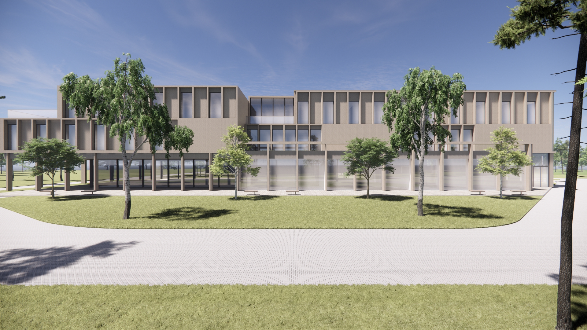 zr b foto realistyczn wizualizacj w otoczeniu lasu mieszanego na elewacji u yj nast puj cych materia w w miejscach gdzie jest faktura drewna u yj drewno naturalne z pionowym us ojeniem lub pionowym podzia em faktura jasnego betonu beton architektoniczny witryny szklane z s upkami w fasadach kolor antracytowy otoczenie u yj naturalnego otoczenia traw mog by te trawy ozdobne nawierzchnia z kostki betonowej u o onej w jode k parkingi z kostki a urowej z traw w wype nieniu nie zmieniaj architektury i uk adu dr g dodaj ludzi biznes jaki samoch w