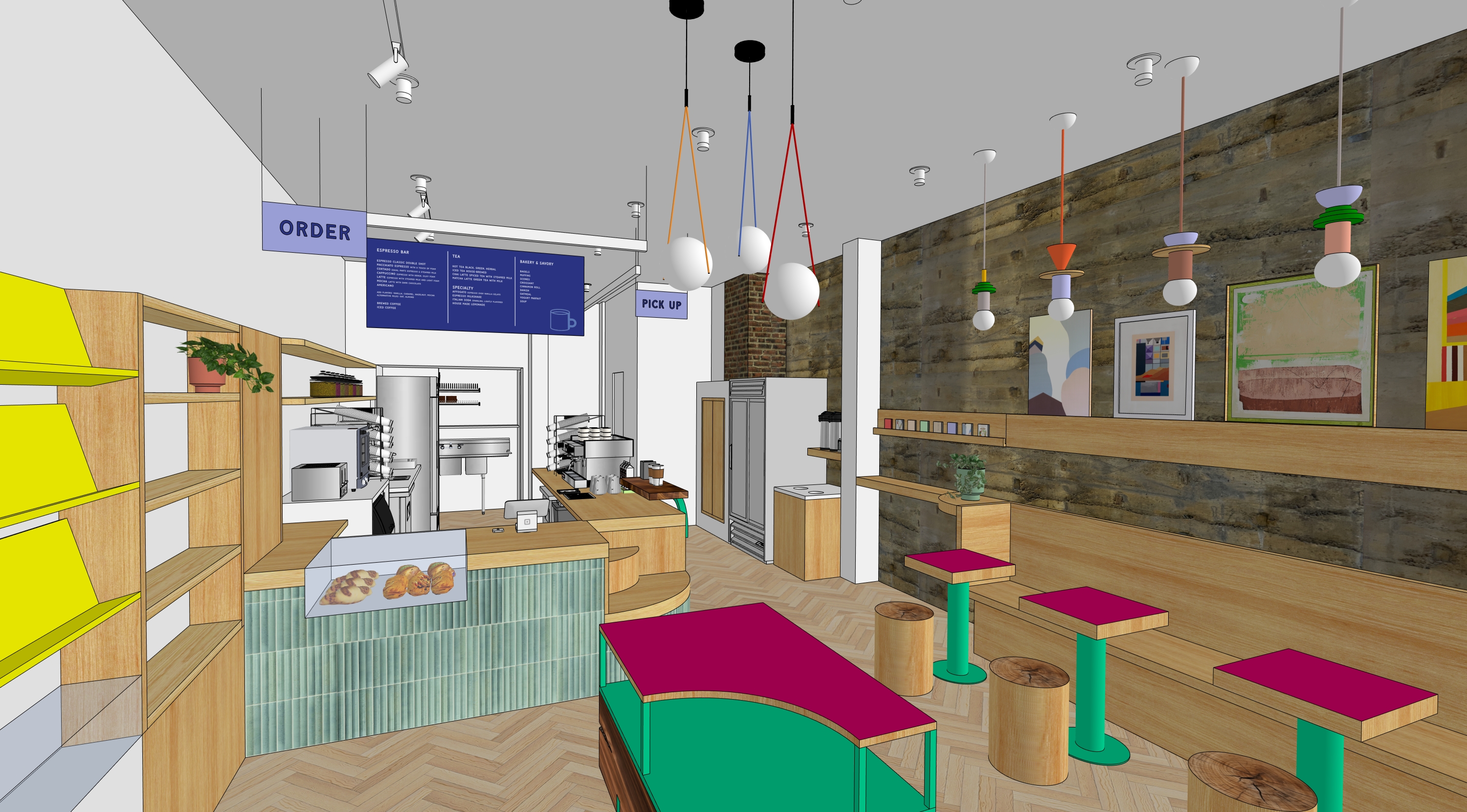 modernist exterior shot this is an interior view of a coffee shop the ordering counter has tile on its facade and the furniture is oak and jade green powder coated metal the left of the room has a small area of yellow shelving in the center of the image a rectangular storage cabinet is shown next to a refrigerator with glass doors the refigerator has drinks for customers in it the center of the image has globe lights the have a soft glow architecture
