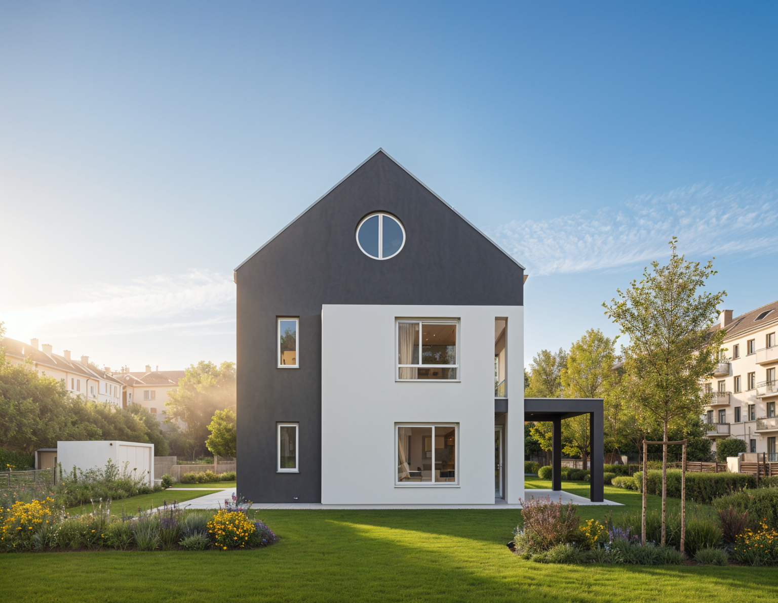 use the provided external house photograph only for the base shape and silhouette do not modify the architecture structure or proportions but completely override all exterior textures materials and surfaces enclose the entire house as if it is fully wrapped inside a perfectly wrapped gift box cover every visible surface including all walls corners edges rooflines and fa ade geometry in a continuous layer of christmas wrapping paper the original exterior must not be visible anywhere the wrapping should be smooth tight seamless and boxed in with crisp edges just like a real wrapped present add a large red ribbon running horizontally and vertically around the entire house with an oversized bow on the front include heavy falling snow and realistic snow accumulation on the wrapped surfaces roofline shape ground and surroundings add subtle christmas lights along the eaves and window areas without altering the architecture render the final image in very high resolution with realistic lighting shadows and material reflections