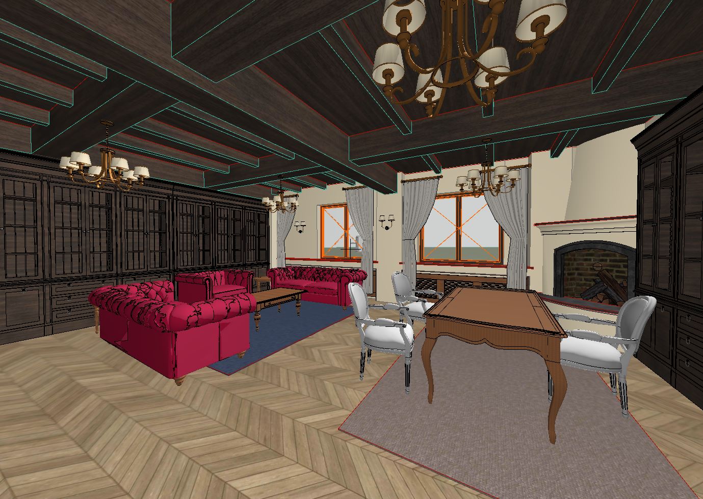 interior design of a classical manor the walls have beige limewash finish the flooring is hardwood floor herringbone pattern with a natural finish the ceiling has wood paneling with classic models the chandelier and sconces are light up and cast warm lights and their shadows touch the walls and give a dramatic effect on the right there is a desk that is hardwood oak natural finish the chairs around the desk have oak natural finish with bordeaux colored velvet upholstery under the desk area there is a classical style carpet on the left there are two chesterfield sofas and one chesterfield chair that have all bordeaux leather upholstery under the sofas area there is a large classical style carpet on the left wall there is a bookcase that has natural oak finish and is filled with books in the right far corner there is a large fireplace with classical trim marble countertops and with the fire burning on the far front wall there are two large windows with the warm sunlight coming in that casts soft shadows there are also classical white see trough drapes format picture 16 9 editorial style photo eye level time of day is noon extradetailed and ultrarealistic interior there are decorative elements all around to make it look more realistic all elements have sharp details subtle fabric wrinkles slight surface reflections natural daylight with soft shadows high detailed cinematic lighting color grading natural lighting global illumination ray tracing ambient occlusion chromatic aberration anti aliasing post processing super detailed