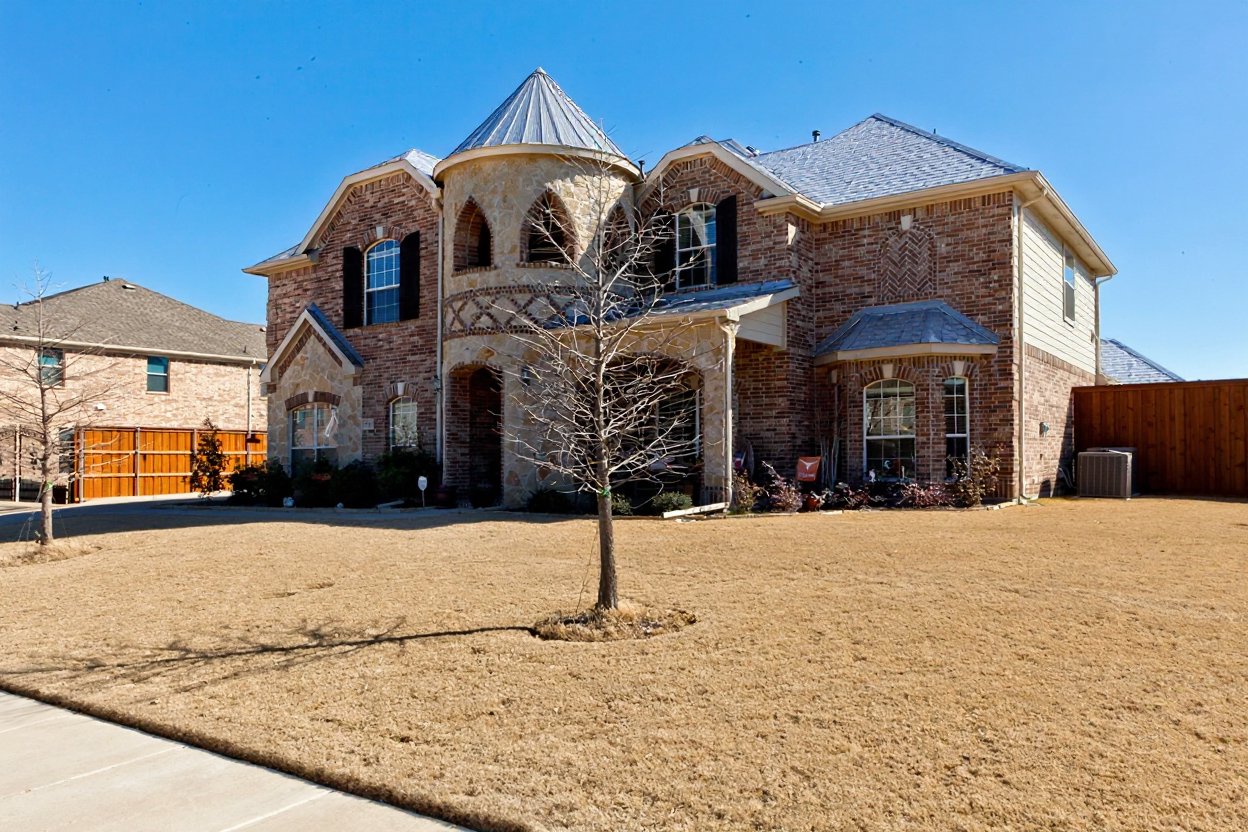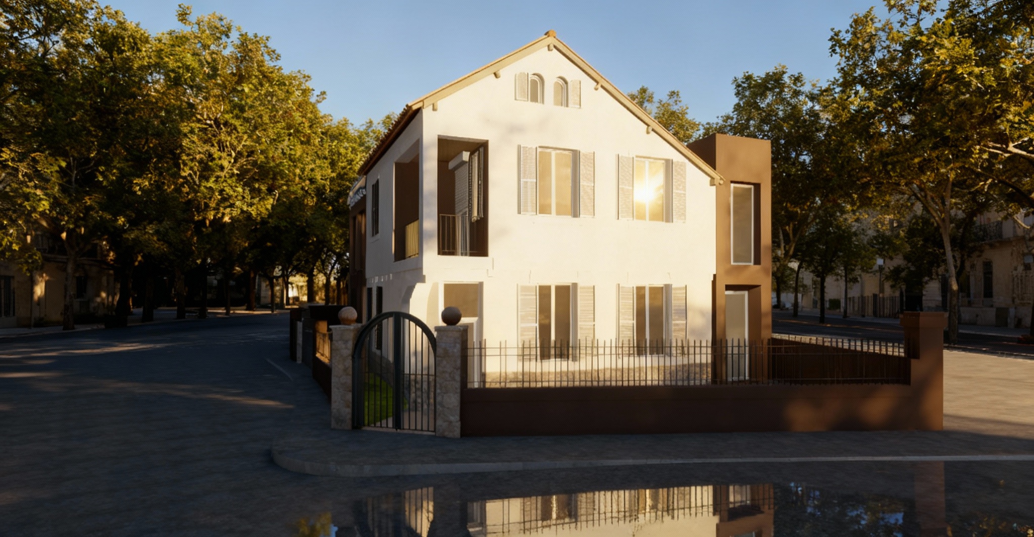 a modern two story house featuring a sleek design with contrasting vertical paneling the house exterior is a combination of warm beige and deep charcoal gray complemented by large clear glass windows the roof is a dark gray textured shingle surrounding the house vibrant green grass and lush trees create a serene and inviting environment the sky above is a vivid blue with soft fluffy gray clouds in the foreground a steel gray pickup truck parked on a smooth dark gray driveway adds a touch of everyday life the atmosphere is peaceful and contemporary with a focus on clean lines and natural colors