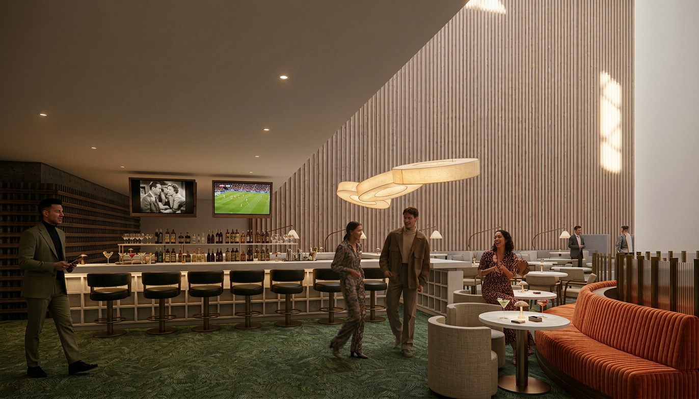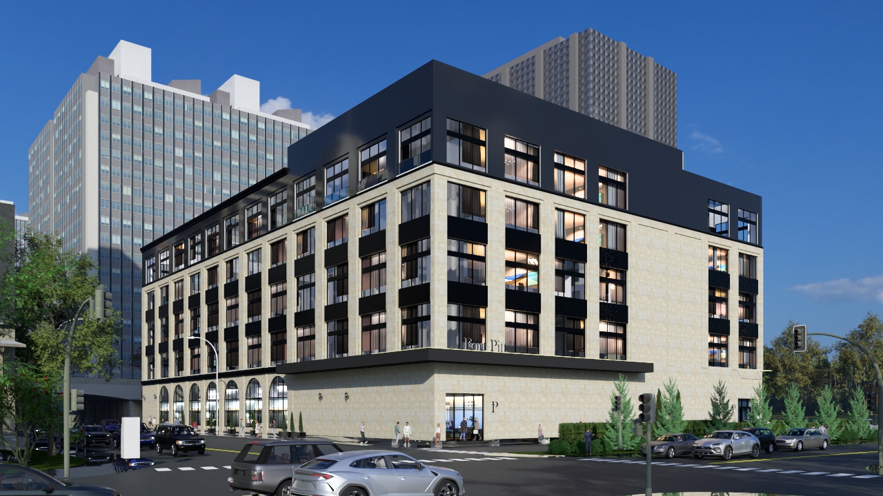 use the attached reference image as the base composition and massing of the building but redesign it into a timeless office building a professional architect create a modern yet timeless office building typical of united states commercial architecture combining contemporary design with subtle classical influences the building must feature a prominent and elegant main entrance located at the corner of the building this corner entrance should act as a strong architectural focal point with a grand refined presence possibly including a double height entry generous glazing refined detailing and architectural framing that highlights the corner the architectural style should feel high end corporate and enduring avoiding trendy or temporary design elements emphasize quality materials especially cast stone combined with glass and metal accents include subtle classical elements such as proportions symmetry refined cornices pilasters or stone detailing interpreted in a modern way the fa ade should feel balanced elegant and professional similar to premium office buildings found in major u s cities the design must communicate prestige permanence and architectural clarity focus on elegant corner entrance as the main focal point cast stone fa ade with modern glass integration timeless proportions and architectural rhythm subtle classical detailing in a contemporary interpretation professional u s office building aesthetic maintain the overall perspective and composition of the reference image but upgrade the design to a refined architect designed timeless office building