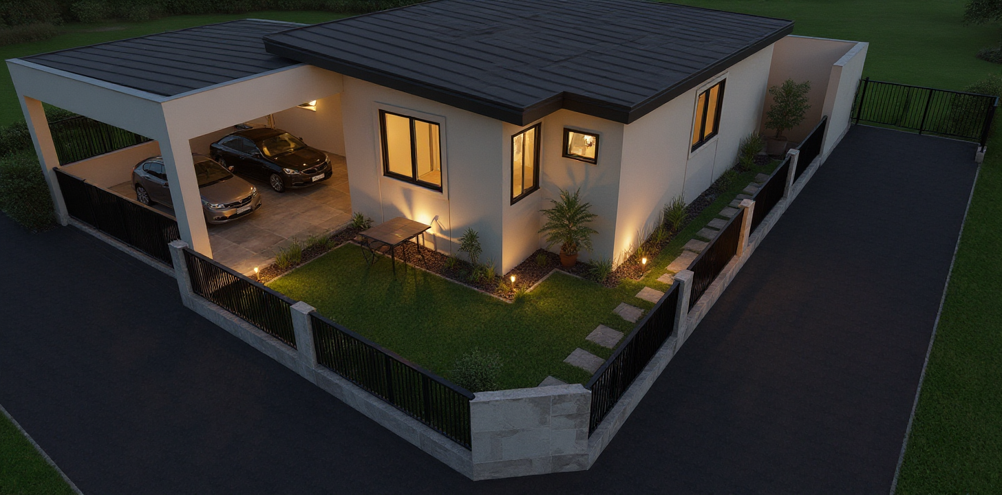 evelop a landscaped garden within the fence filled with lush plants and greenery add a clear pathway with integrated pathway lights create a bright ambient daylight setting with natural well defined shadows for depth and realism japanese garden