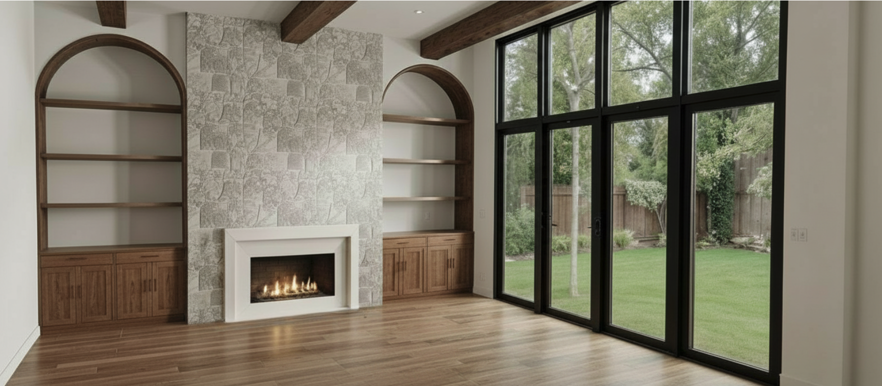 make arched bookshelf millwork less saturated make it a mid tone brown with no red undertone